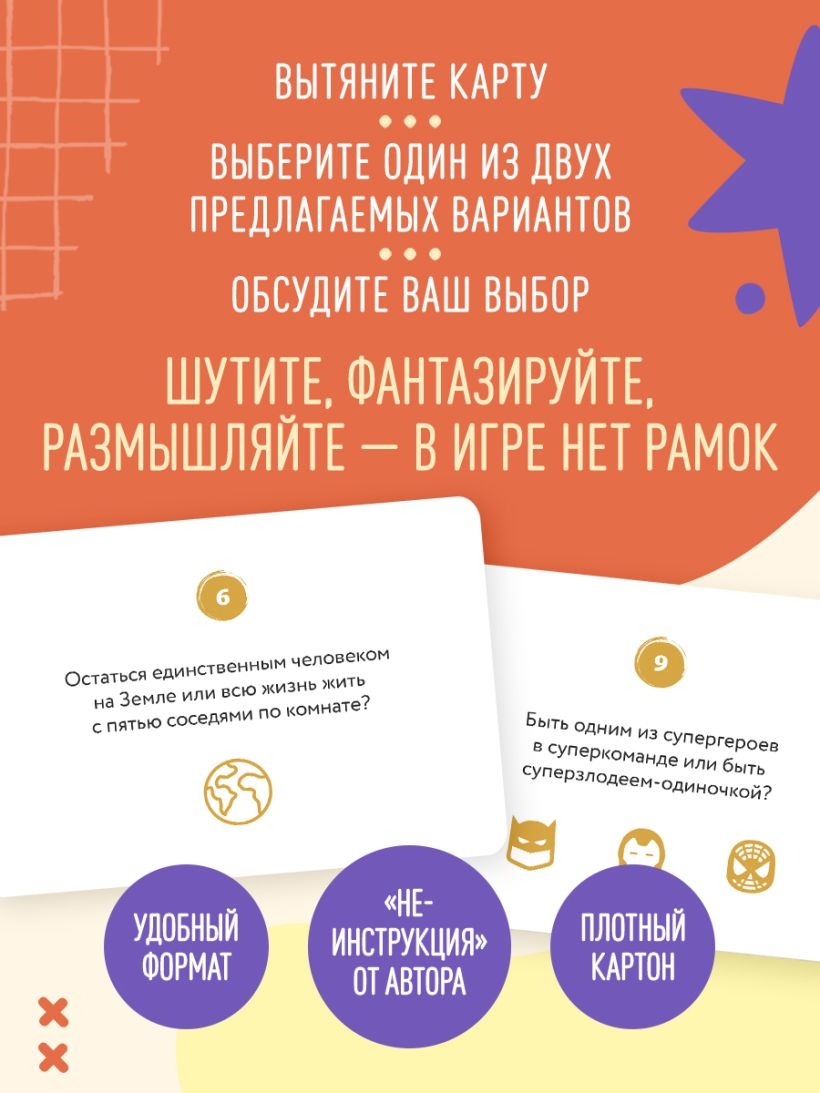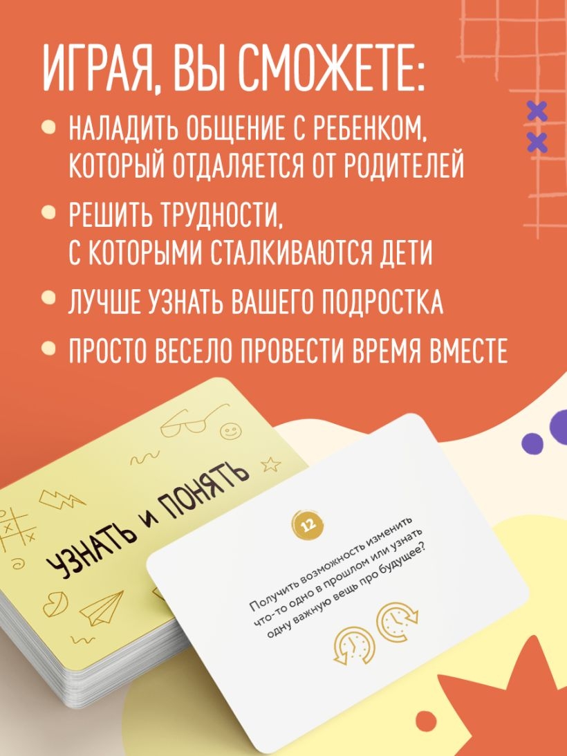 Когда дети взрослеют, родителям приходится заново знакомиться с ними. Чтобы уменьшить дистанцию и узнать, что творится в голове у подростка, важно вместе проводить время. Вопросы ставят участников перед моральным выбором или переносят в необычные ситуации, где нужно быстро сориентироваться и принять решение. Игра поможет понять интересы каждого участника, развивает эмоциональный интеллект и критическое мышление. Она подталкивает подростка и родителя к откровенности и дружескому общению. Правил нет – каждый может проявить фантазию и придумать свои условия.