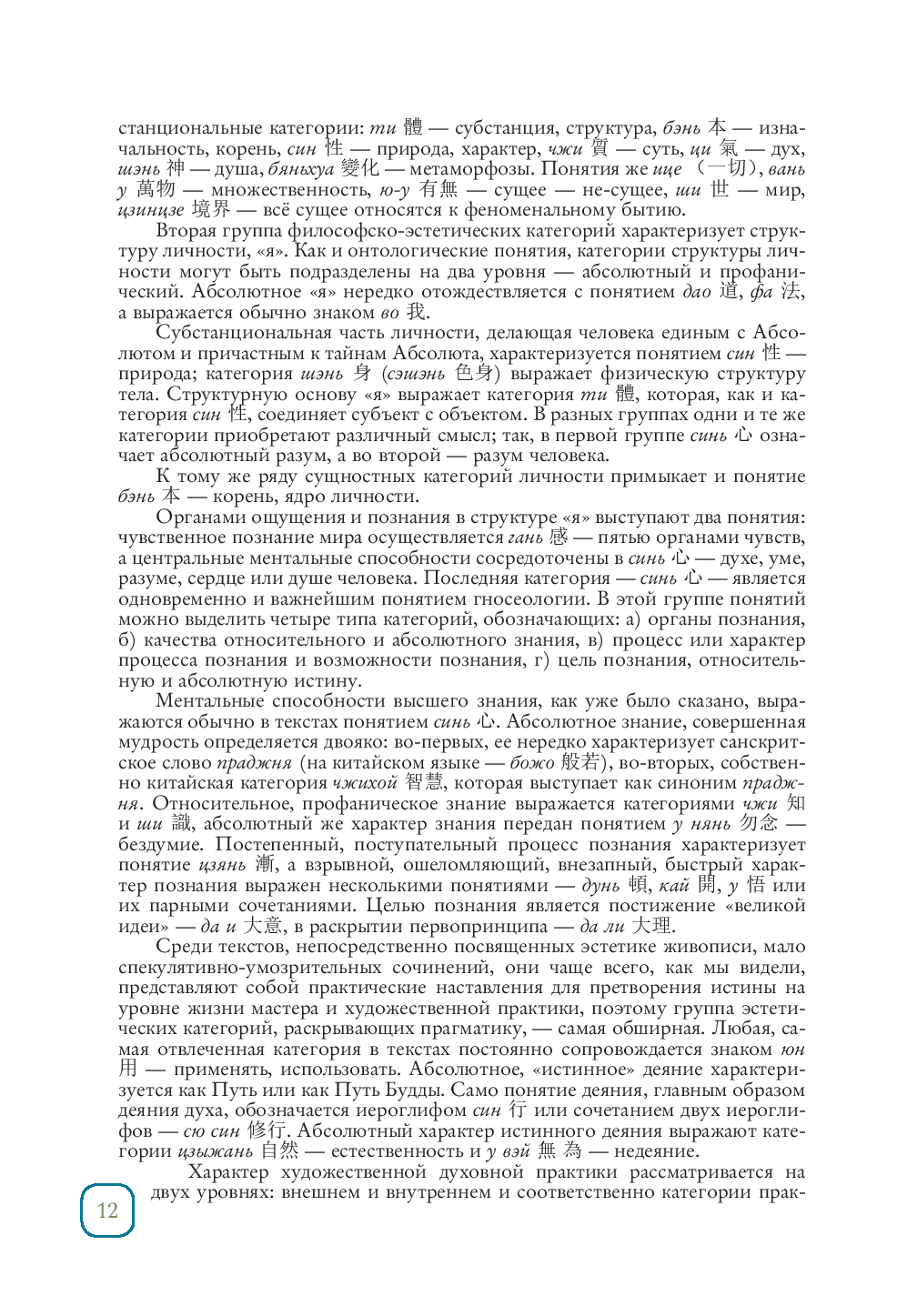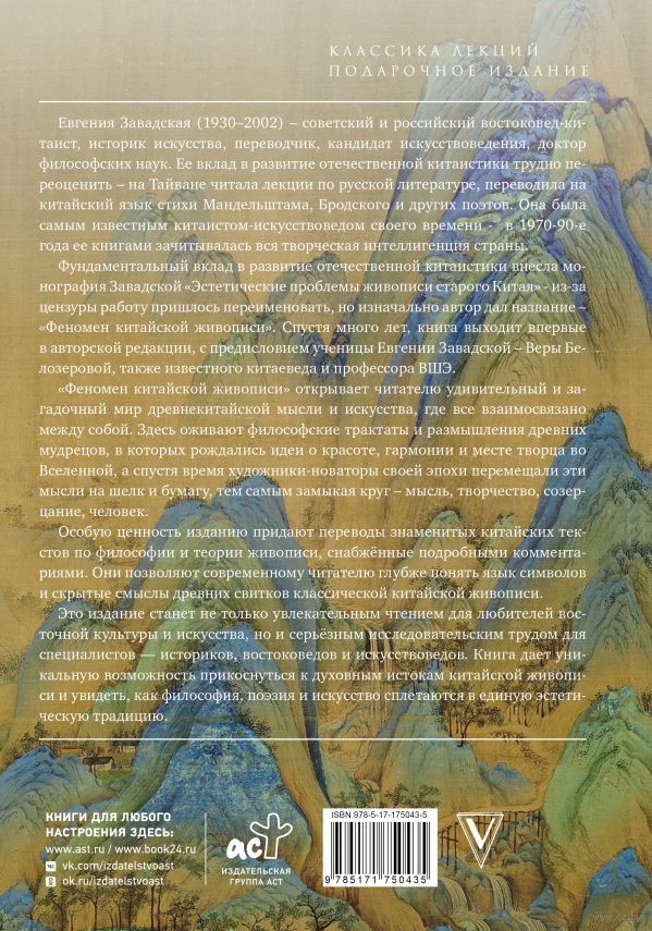 "Феномен китайской живописи" открывает читателю удивительный и загадоч- ный мир древнекитайской мысли и искусства. Здесь оживают философские трактаты и размышления древних мудрецов, в которых рождались идеи о красоте, гармонии и месте человека во Вселенной, а спустя время художники-новаторы своей эпохи воплощали эти мысли на шёлк и бумагу, тем самым замыкая круг – мысль, творчество, созерцание, человек. Особую ценность изданию придают переводы знаменитых китайских текстов по философии и теории живописи, снабжённые подробными комментариями. Они позволяют современному читателю глубже понять язык символов и скрытые смыслы древних свитков традиционной китайской живописи. Это издание станет не только увлекательным чтением для любителей восточ- ной культуры и искусства, но и серьёзным исследовательским трудом для специ- алистов – историков, востоковедов, искусствоведов и культурологов. Книга дает уникальную возможность прикоснуться к духовным истокам китайской живописи и увидеть, как философия, поэзия и искусство сплетаются в единую эстетическую традицию.