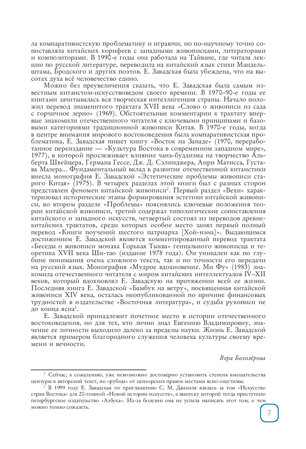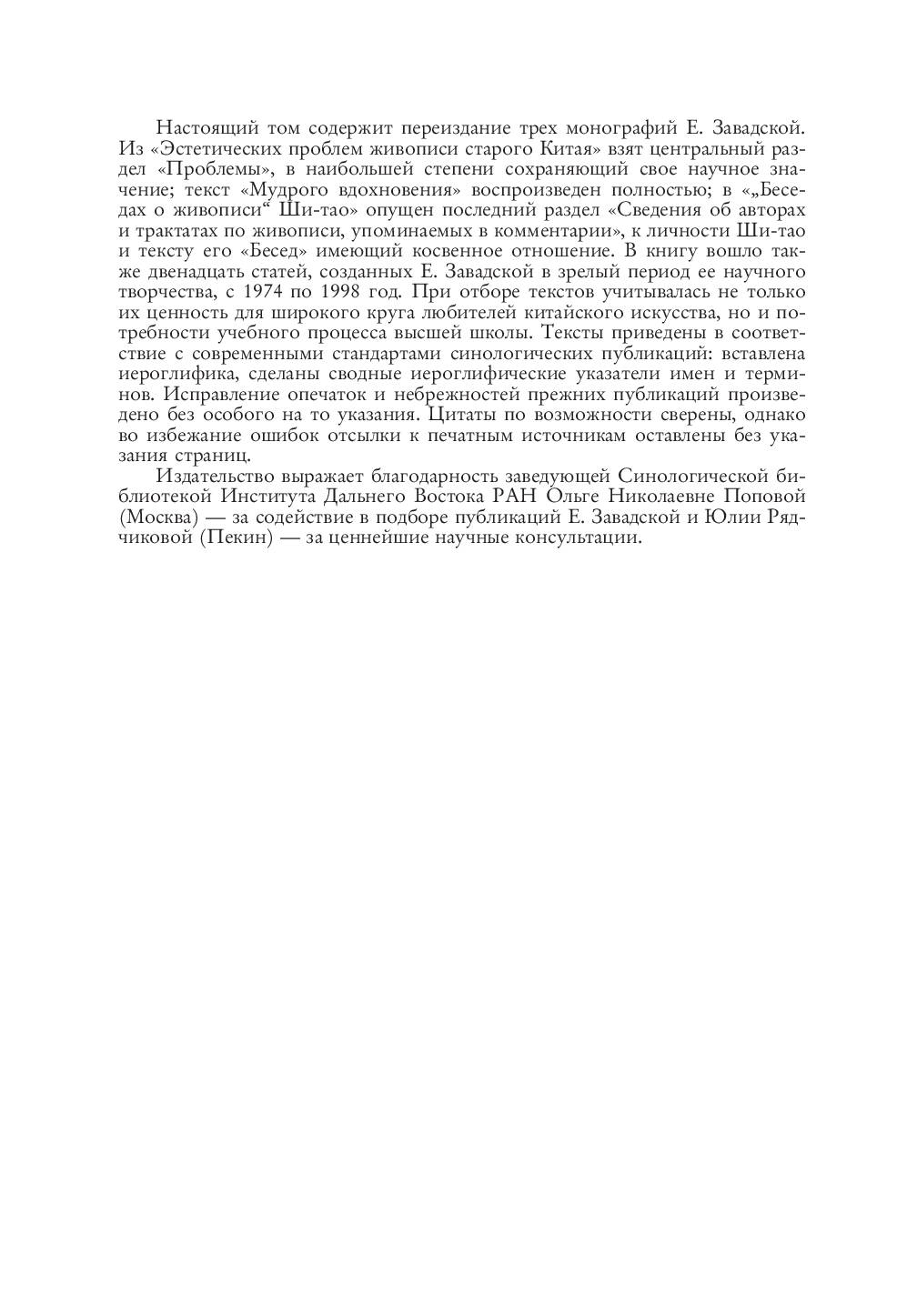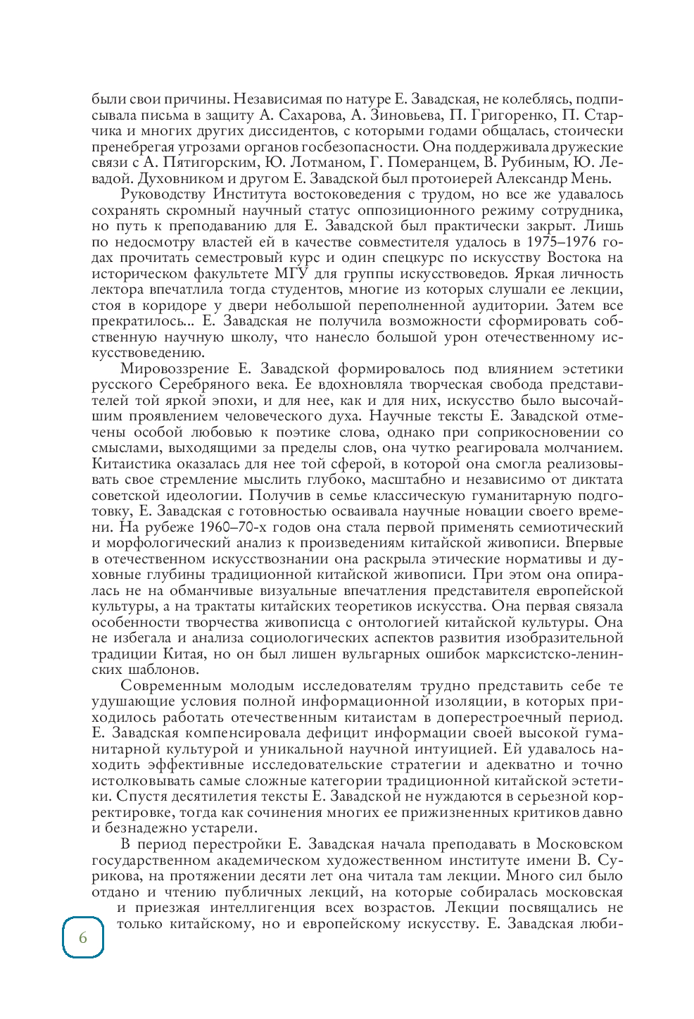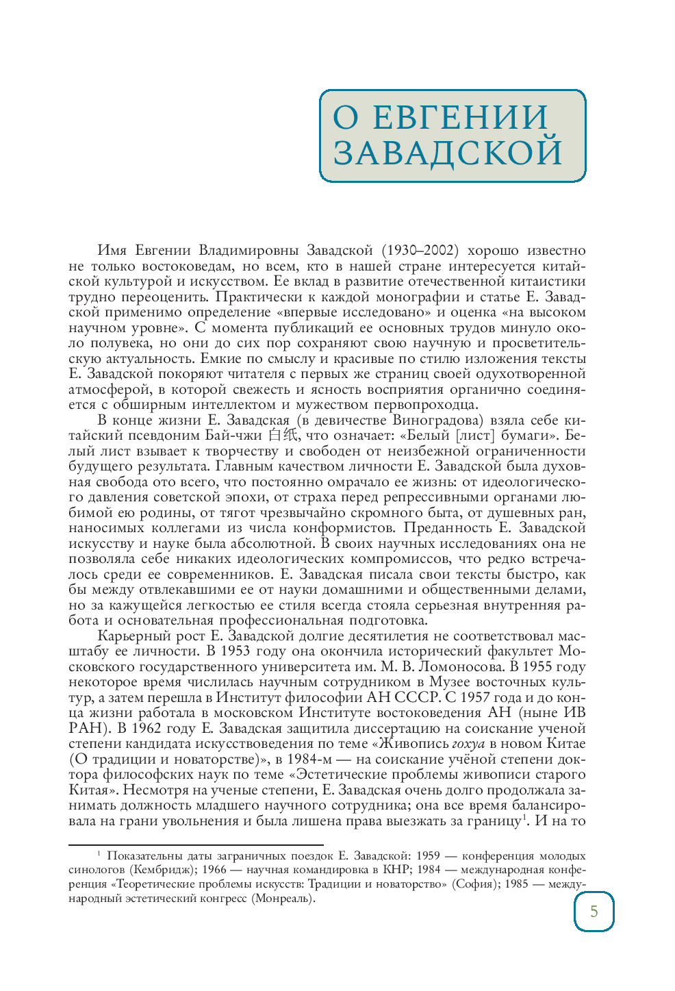 Евгения Завадская (1930–2002) – советский и российский востоковед-китаист, историк искусства, переводчик, кандидат искусствоведения, доктор философских наук. Её участие в развитие отечественной китаистики трудно переоценить – на Тайване читала лекции по русской литературе, переводила на китайский язык сти- хи Мандельштама, Бродского и других поэтов. Она была самым известным кита- истом-искусствоведом своего времени – в 1970-90-е годы её книгами зачитывалась вся творческая интеллигенция страны. Фундаментальный вклад в развитие отечественной китаистики внесла монография Завадской "Эстетические проблемы живописи старого Китая" – из-за цензуры работу пришлось переименовать, но изначально автор дал название – "Феномен ки- тайской живописи".