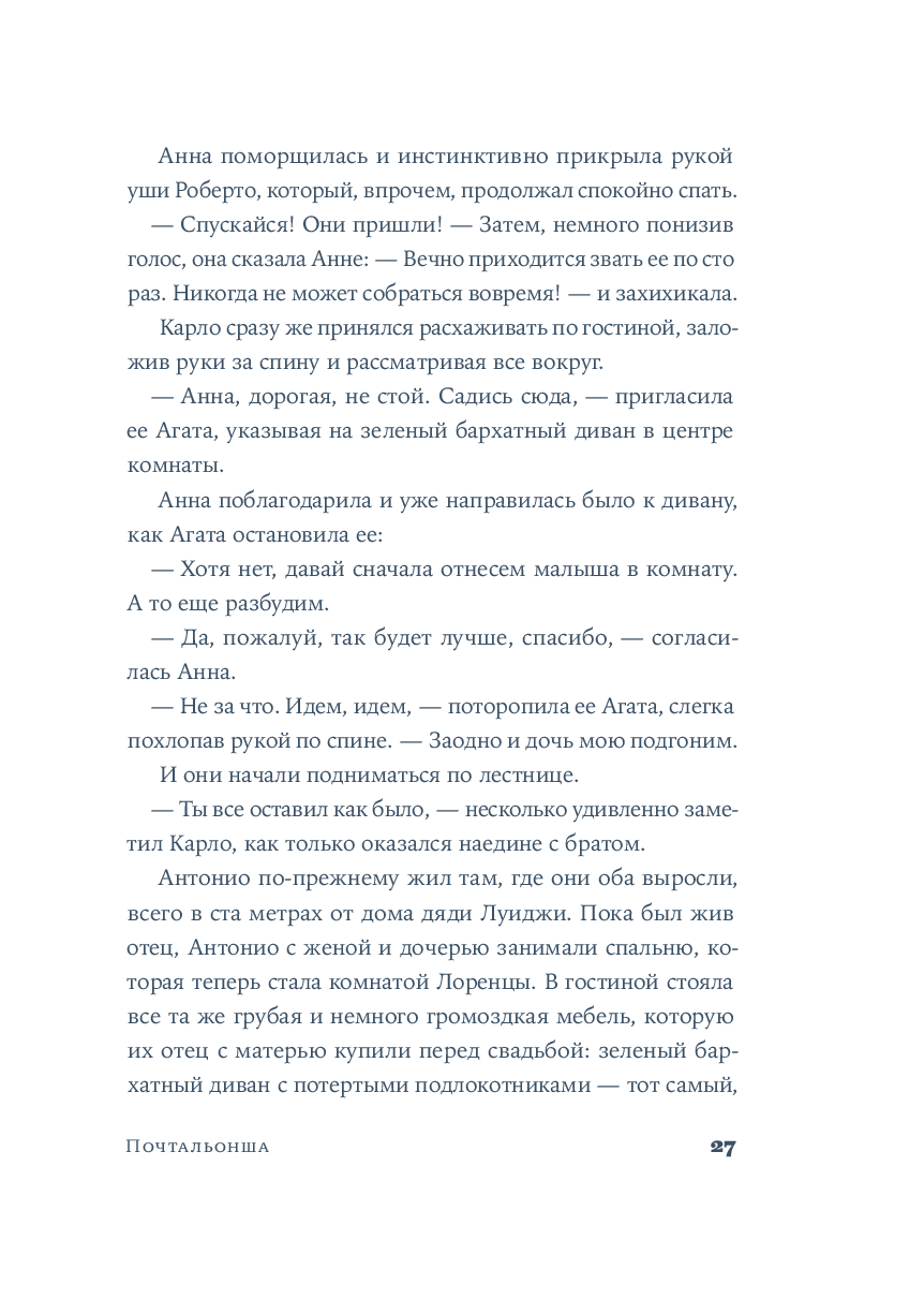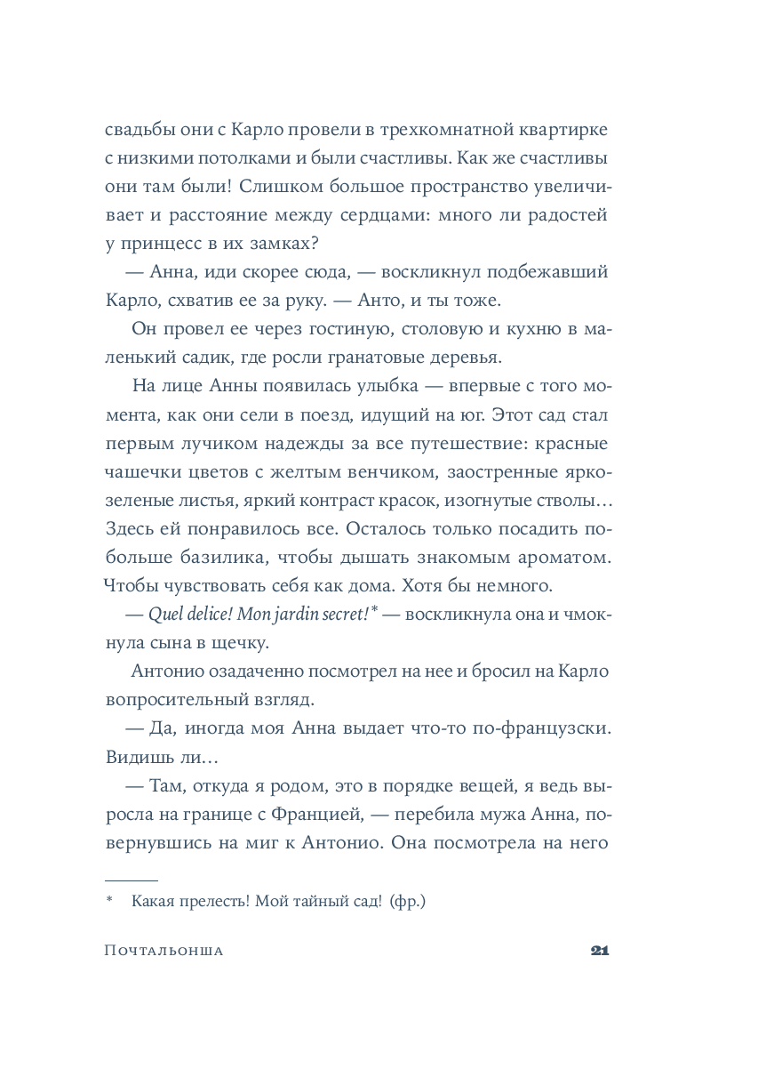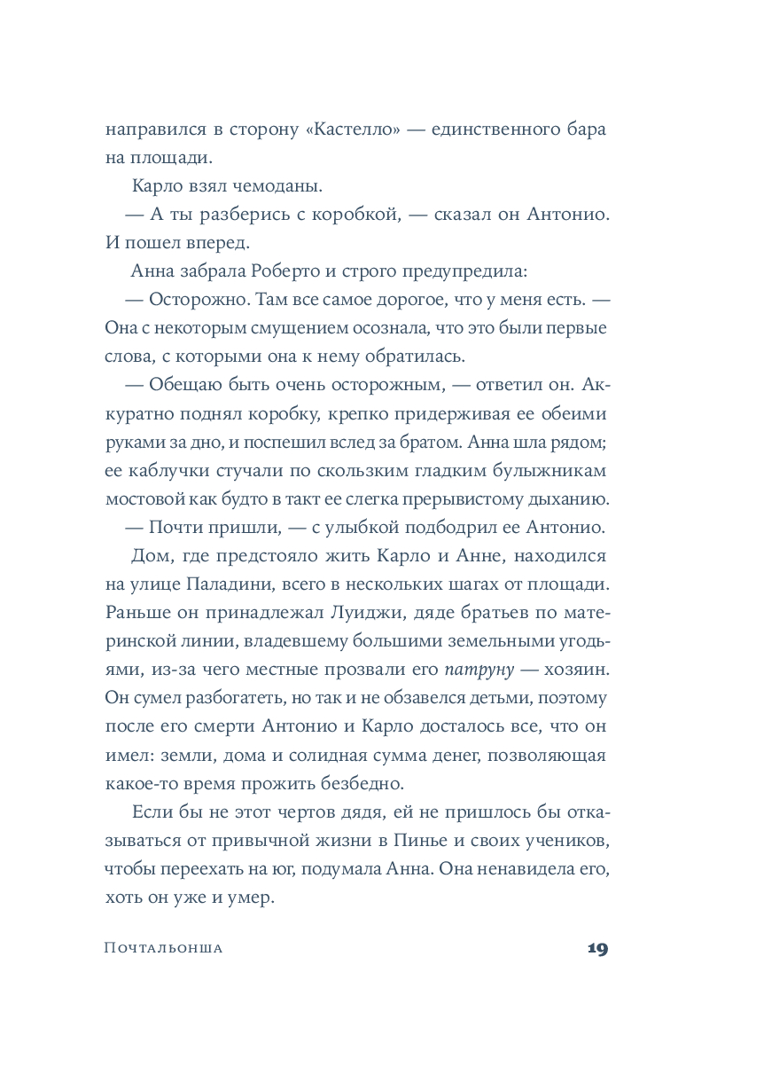 Роман основан на истории прабабушки автора, в нем рассказывается о жизни Анны – молодой женщины с севера Италии, в 1934 году переехавшей вместе с семьей на юг страны, на родину мужа. Став первой женщиной-почтальоном в Лиццанелло, Анна бросает вызов патриархальным устоям общества. Более 20 лет, сначала пешком, а затем на велосипеде, она доставляет жителям важную корреспонденцию – это и письма солдат с фронта, и открытки от тех, кто навсегда покинул Италию, и послания тайных любовников. Анна читает письма неграмотным и даже учит их читать и писать. Сама того не замечая, смелая "чужачка" с севера многое изменит в южном городке и серьезно повлияет на положение женщин в нем.