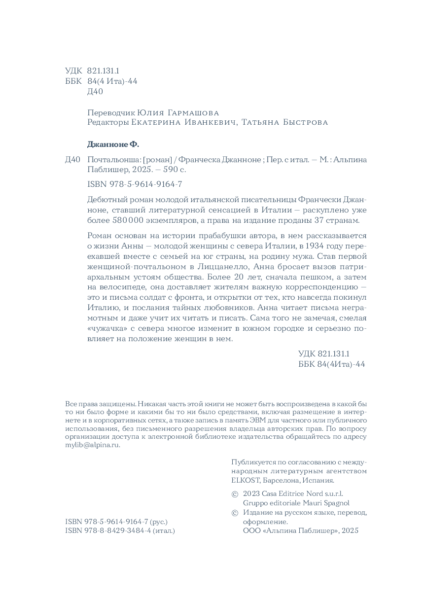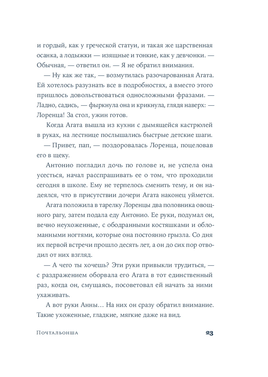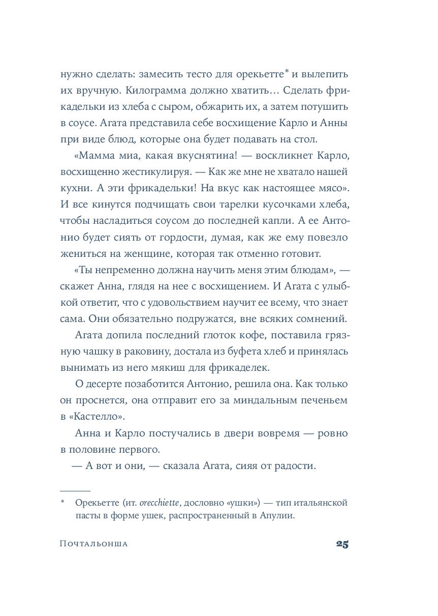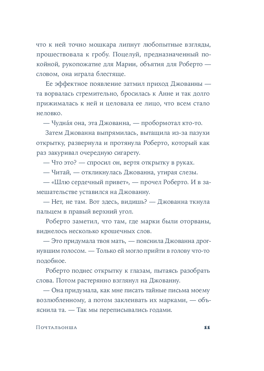 Роман основан на истории прабабушки автора, в нем рассказывается о жизни Анны – молодой женщины с севера Италии, в 1934 году переехавшей вместе с семьей на юг страны, на родину мужа. Став первой женщиной-почтальоном в Лиццанелло, Анна бросает вызов патриархальным устоям общества. Более 20 лет, сначала пешком, а затем на велосипеде, она доставляет жителям важную корреспонденцию – это и письма солдат с фронта, и открытки от тех, кто навсегда покинул Италию, и послания тайных любовников. Анна читает письма неграмотным и даже учит их читать и писать. Сама того не замечая, смелая "чужачка" с севера многое изменит в южном городке и серьезно повлияет на положение женщин в нем.