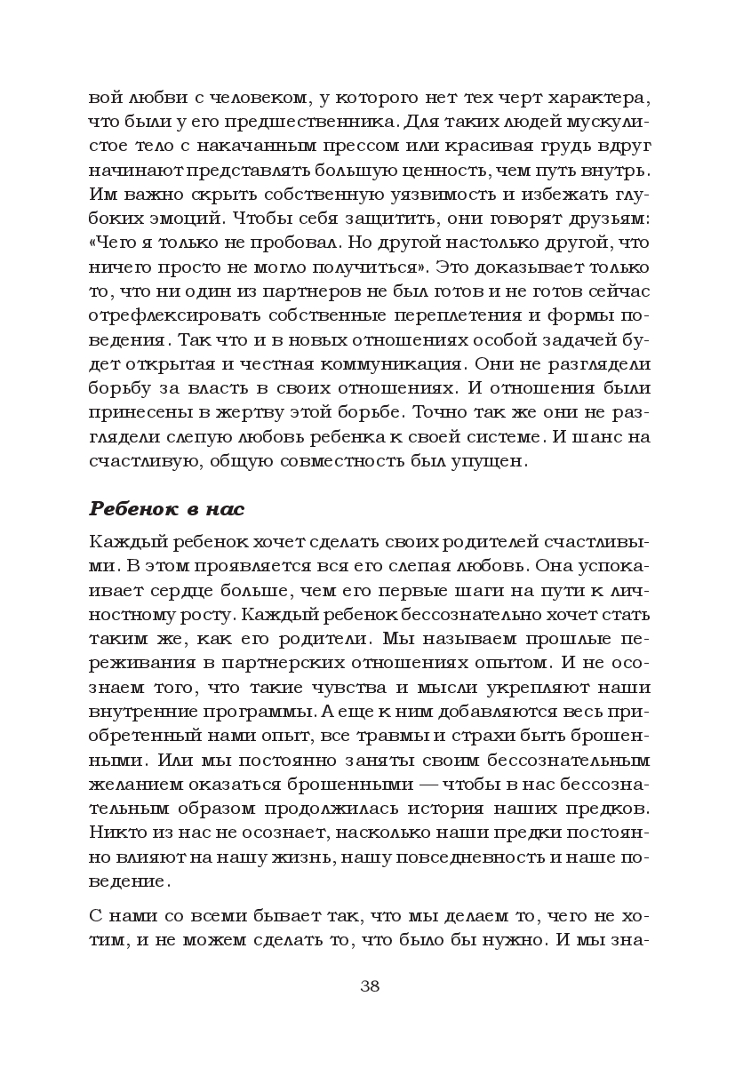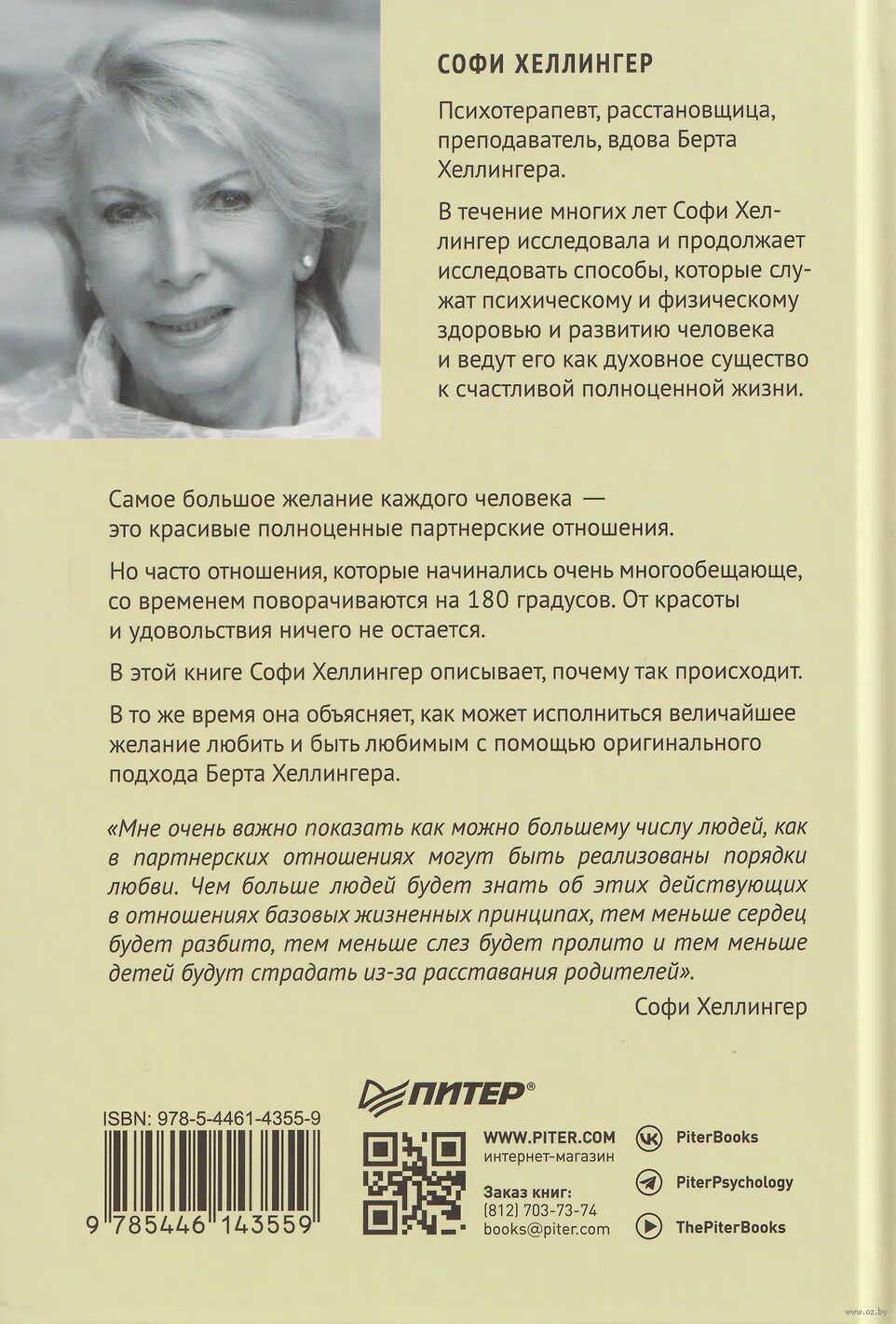 Самое большое желание каждого человека – это полноценные партнерские отношения. Но многие из них, которые начинались очень многообещающе, со временем повернулись на 180 градусов. От красоты и удовольствия отношений почти ничего не осталось. В этой книге Софи Хеллингер описывает различные серьезные предпосылки такой ситуации. В то же время она объясняет, как может исполниться величайшее желание любить и быть любимым с помощью оригинального семейного подхода Хеллингера.