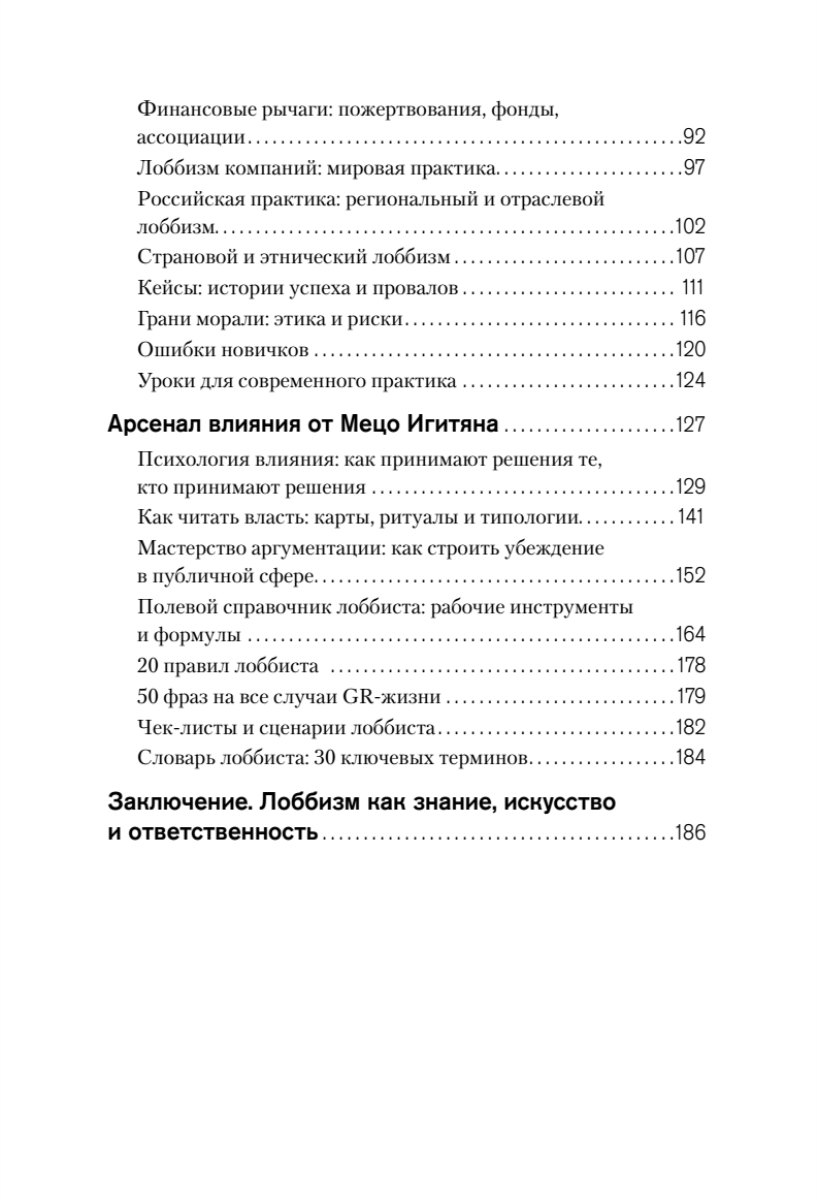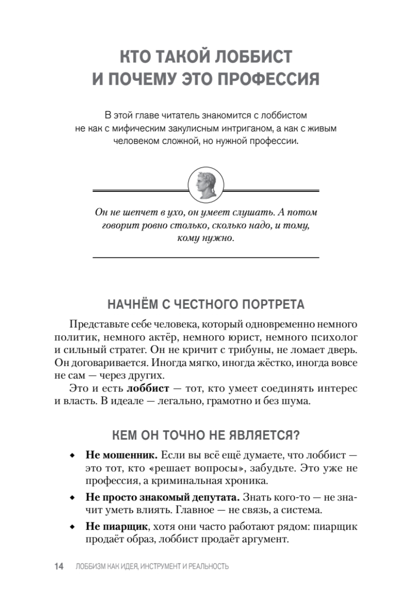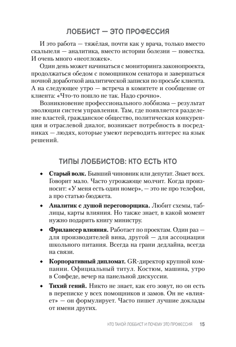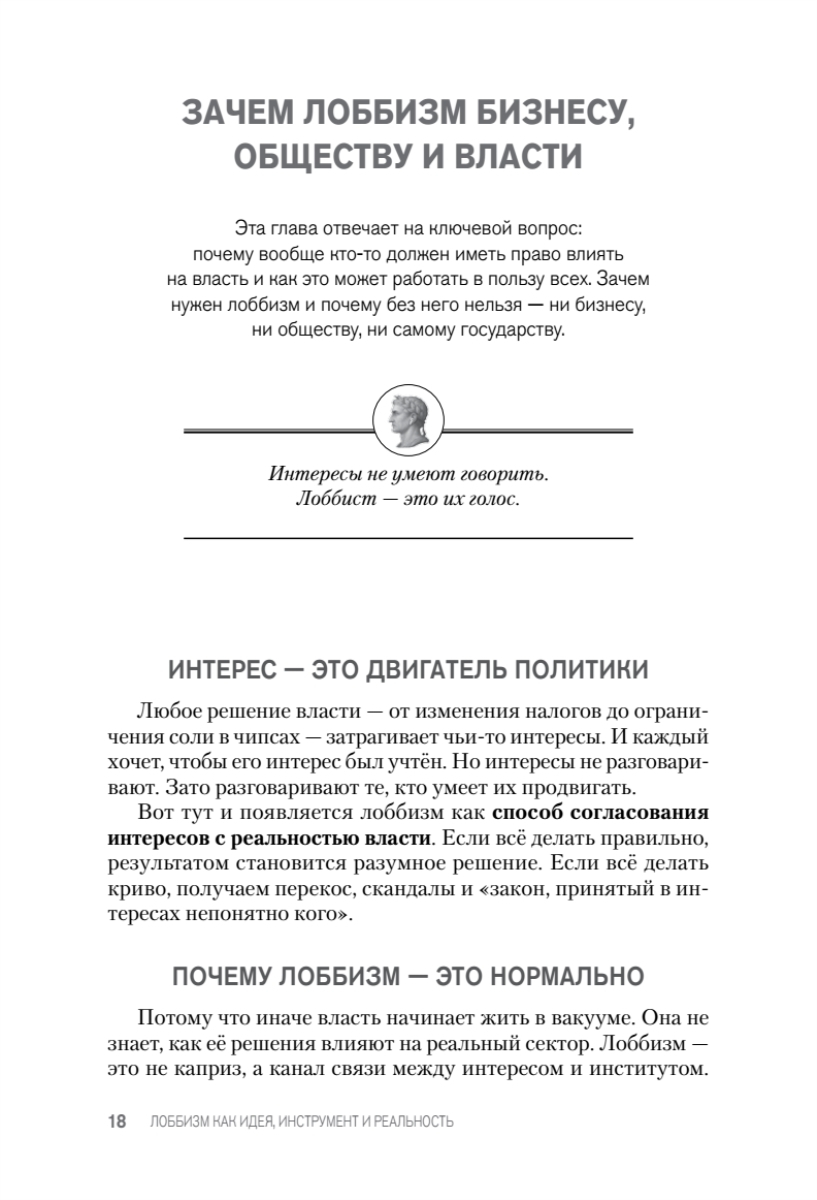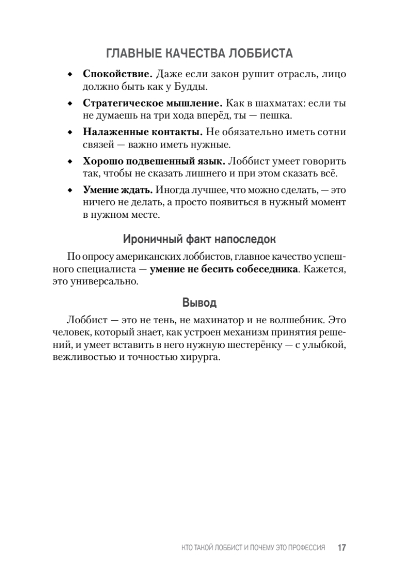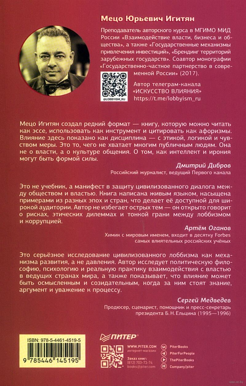 Что отличает успешный лоббизм от коррупции? Как превратить запросы бизнеса в реальные решения власти? В книге "Лоббизм. Искусство влияния" представлен глубокий анализ механизмов влияния на принятие государственных решений. Автор раскрывает ключевые компетенции профессионального лоббиста, описывает стратегии работы с органами власти и показывает, как различные группы интересов – от компаний до целых регионов – могут эффективно продвигать свои инициативы. Издание содержит практические рекомендации по выстраиванию конструктивного диалога с властью и демонстрирует, как лоббизм может стать инструментом развития общества, а не просто способом получения выгоды.