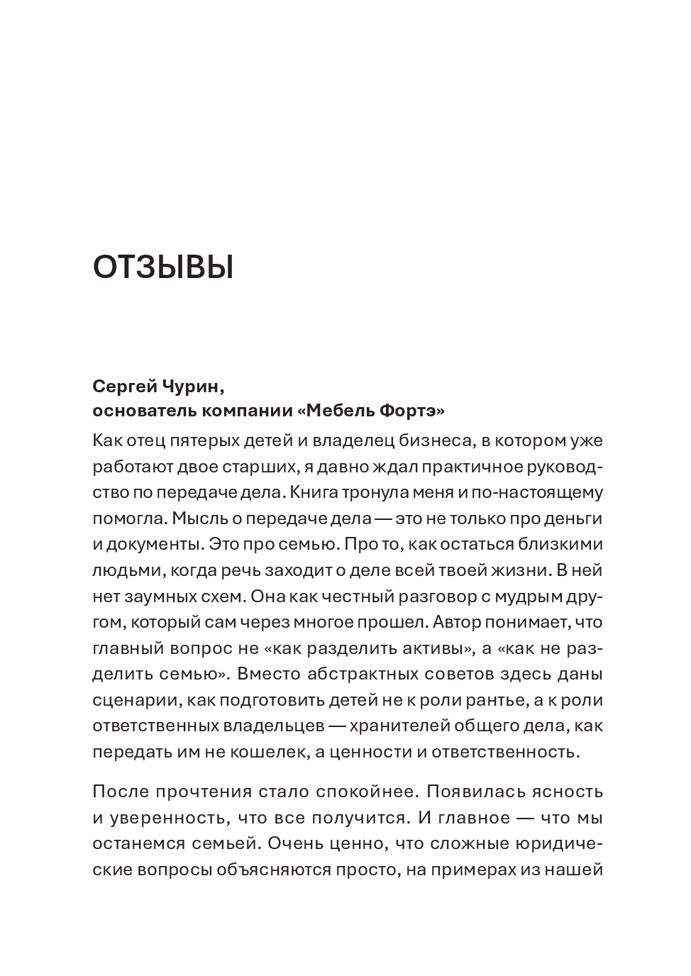 Теория иллюстрируется многими примерами из российской и зарубежной практики, среди которых есть яркие примеры из личного опыта автора. Издание раскрывает секреты владельческой преемственности для разных ситуаций, в которых многие владельцы и преемники могут увидеть себя.