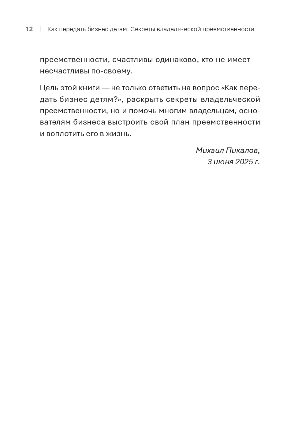 Книга "Как передать бизнес детям. Секреты владельческой преемственности" предназначена для владельцев бизнеса, их преемников, сотрудников семейных офисов, семейных консультантов, психологов, наставников. Она поднимает тему владельческой преемственности и дает ответы на сложные вопросы передачи бизнеса следующему поколению собственников в нашей стране.