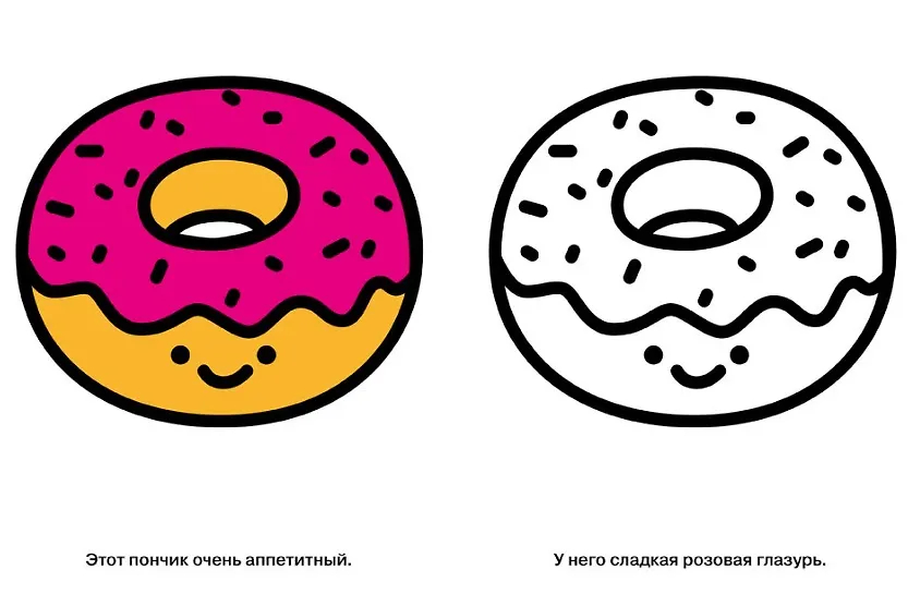Крупные и простые иллюстрации легко воспринимаются детьми, толстые контуры не позволяют выходить за границы рисунка. А яркие цветные образцы на каждой странице служат отличным примером и вдохновляют на создание собственных работ.