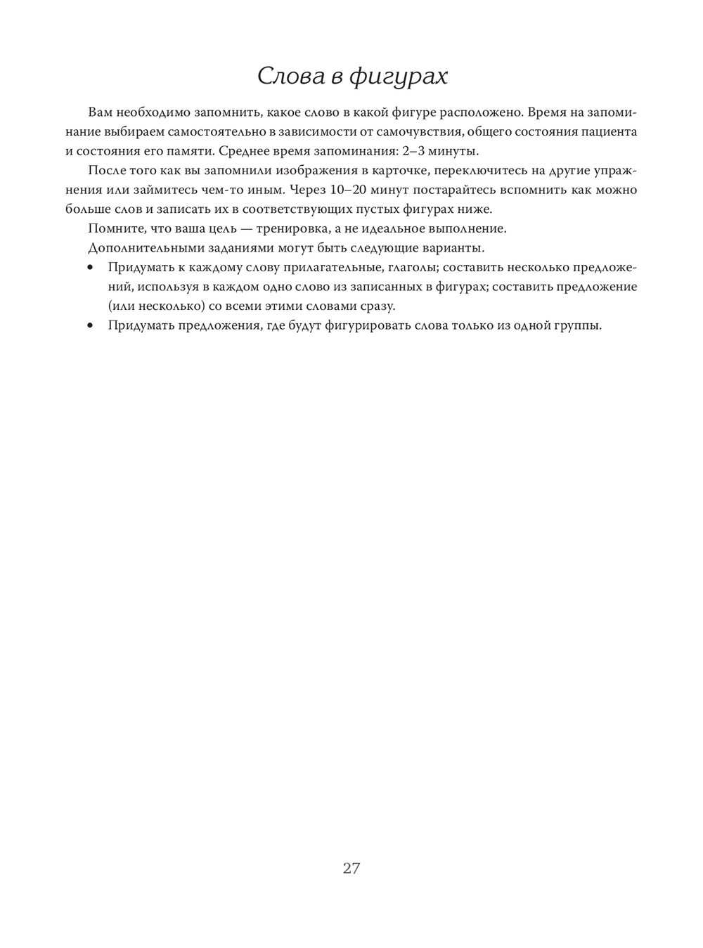 Адресована широкому кругу читателей: пациентам, перенесшим инсульты, черепно-мозговые травмы, нейроинфекции, опухоли и другие заболевания центральной нервной системы и имеющим нарушения нейропсихологического статуса, а также пациентам, перенесшим COVID-19 и имеющим когнитивные нарушения, и их родственникам. Издание станет прекрасным подспорьем для специалистов (логопедов, нейропсихологов, врачей различных специальностей), работающих с такими пациентами.