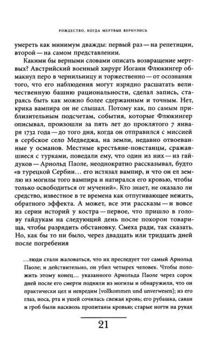 Автор увлекательно и иронично рассказывает о том, как идеи вампиризма и возвращения с того света существовали в славянских, финно-угорских, романских, германских, скандинавских культурах; о том, почему местом обиталища кровососов представлялась Трансильвания; о том, как после книги Б. Стокера образ вампира освоила массовая культура.