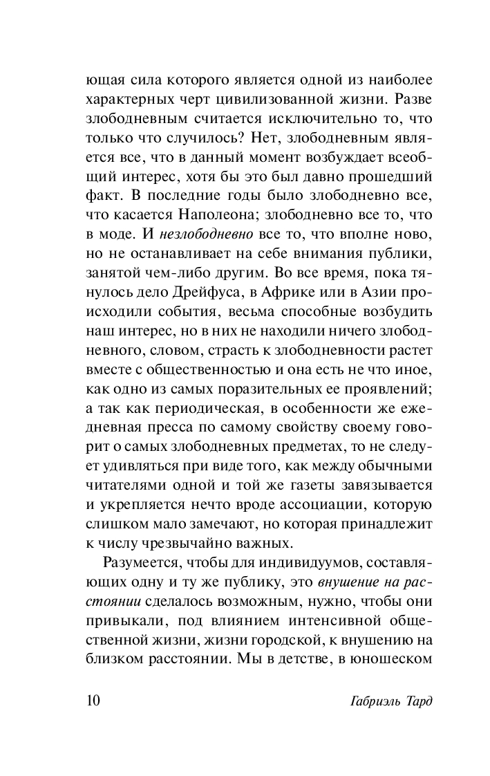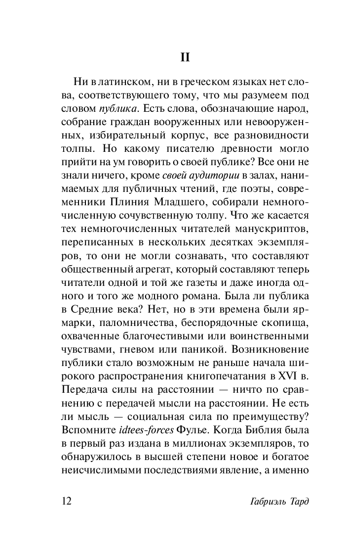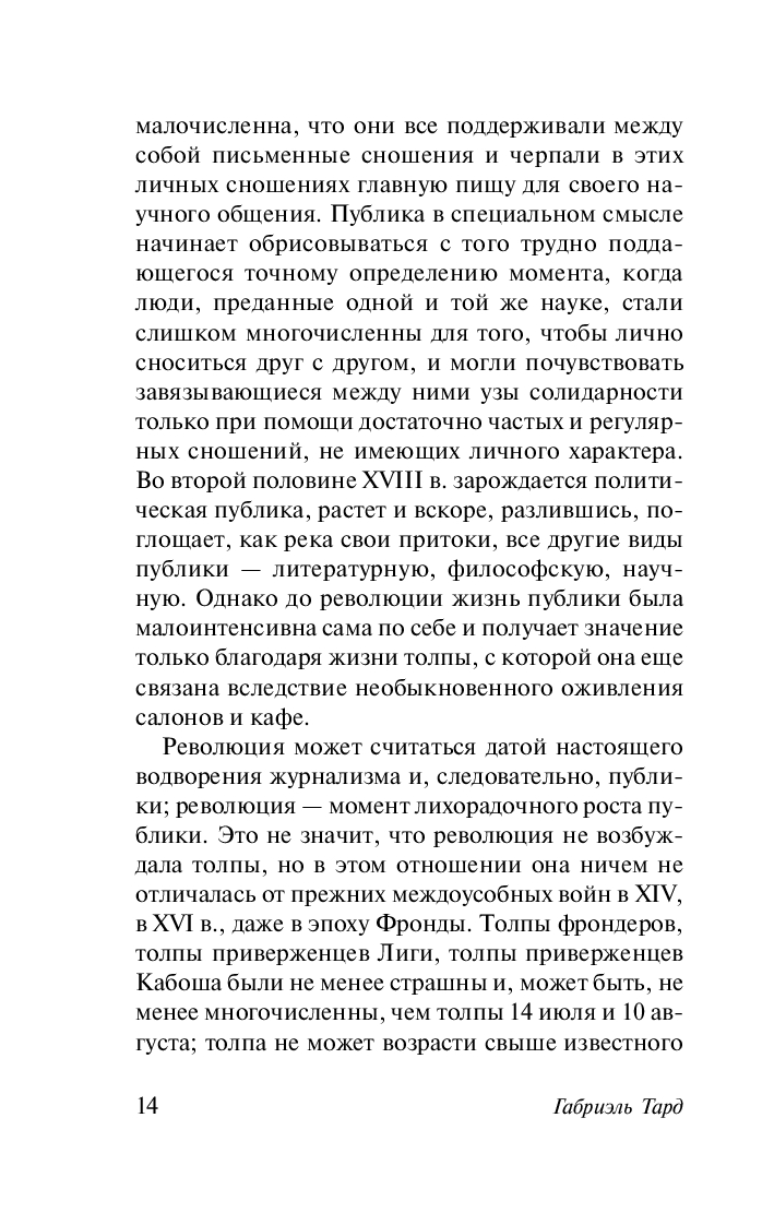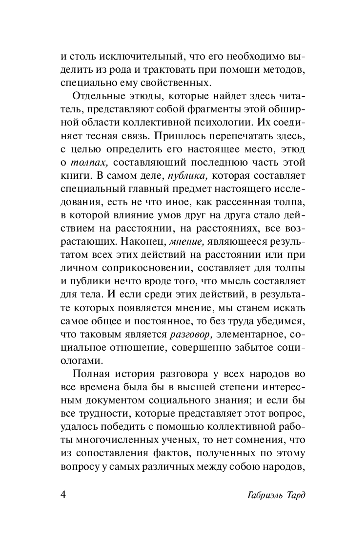 "Общественное мнение и толпа" – книга, впервые опубликованная Тардом еще в 1892 г., но не утратившая актуальности и в наши дни, одно из основополагающих произведений теории массовой коммуникации. В ней ученый рассуждает на тему "публики" как высшей формы толпы – косной и легковерной массы, недолговечной и зависимой от своего вождя.