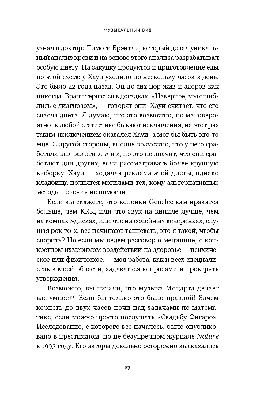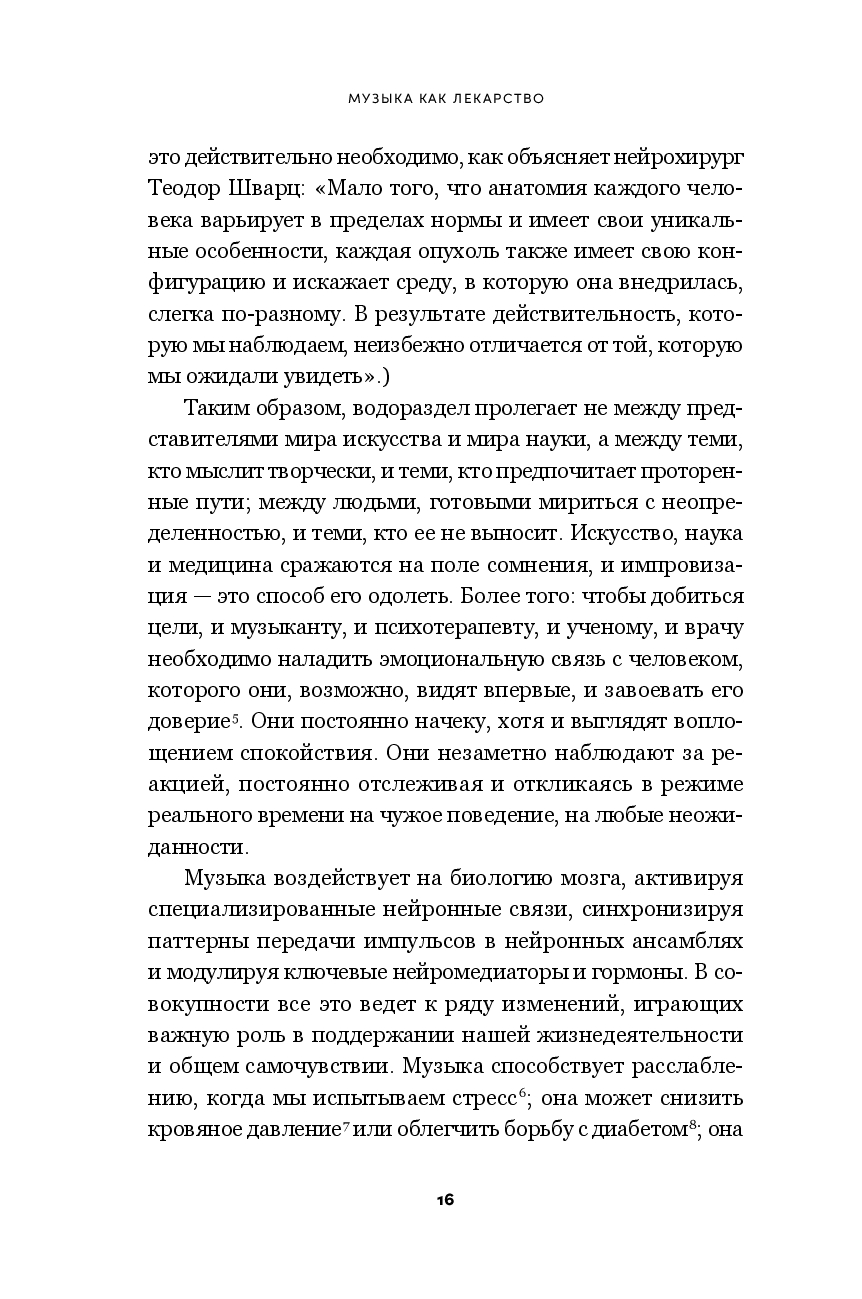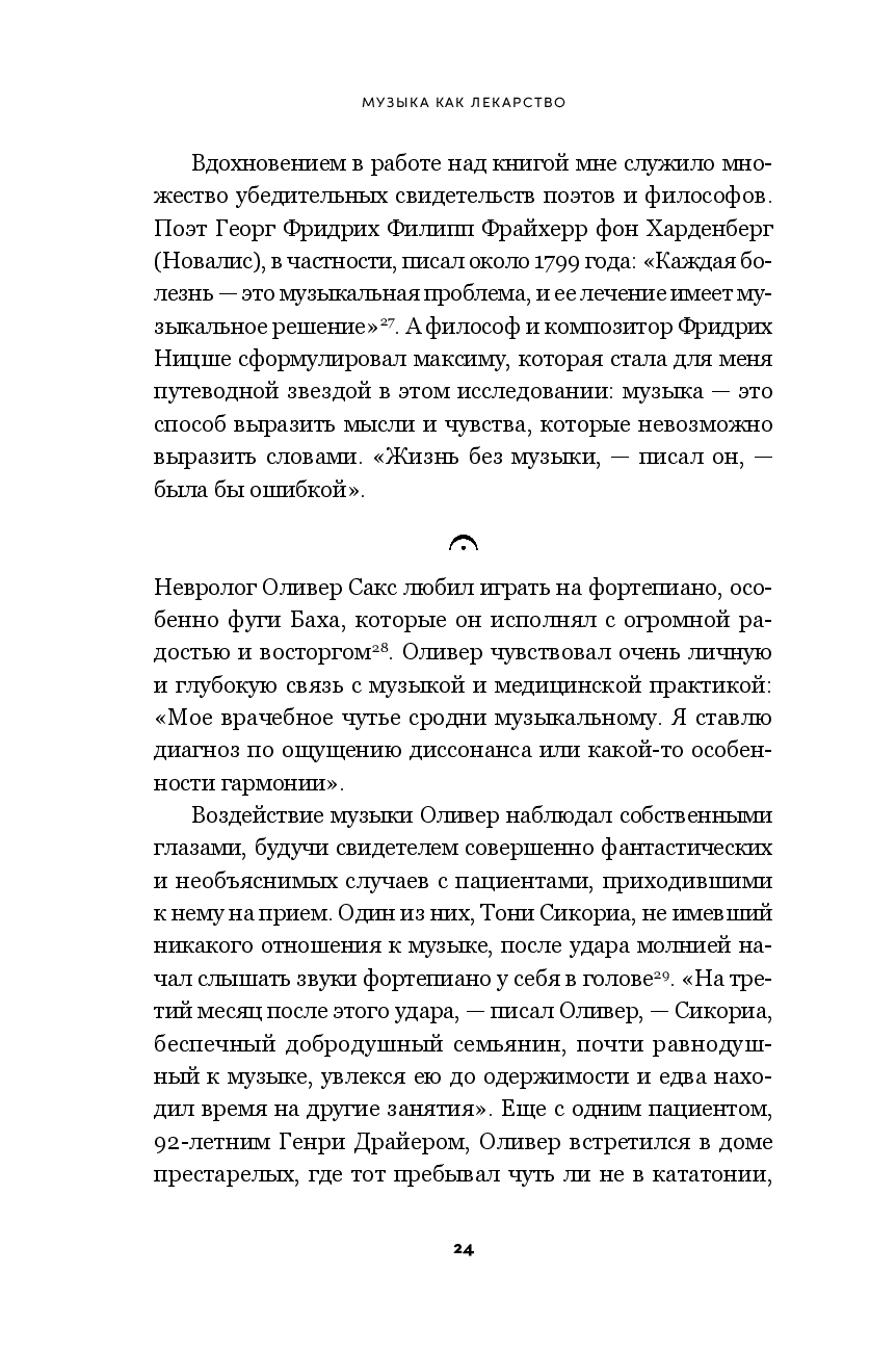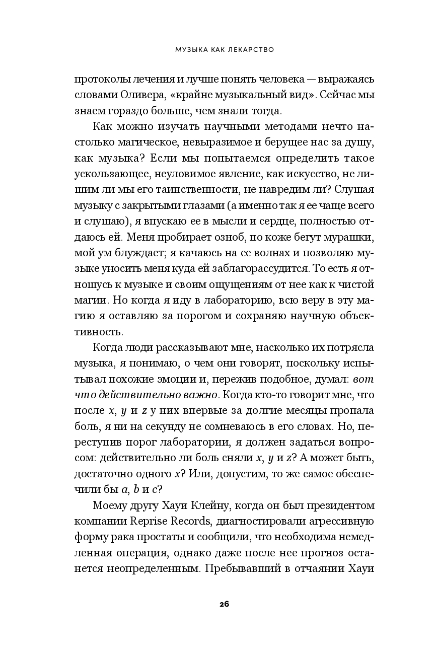 Музыка – одно из древнейших лекарств в истории человечества. От Дальнего Востока до Османской империи, от Европы до Африки и доколониальной Америки многие культуры разработали богатые традиции использования звука и ритма для облегчения страданий и помощи в исцелении. Современные исследования подтверждают, что музыка воздействует на биологию мозга, активизируя специализированные нейронные пути, синхронизируя паттерны передачи импульсов в нейронных ансамблях и модулируя ключевые нейропередатчики. Описывая результаты нейробиологических исследований и анализируя целебные свойства музыки, Левитин показывает, как и почему она может помогать и сегодня при лечении нейродегенеративных заболеваний, таких как болезнь Паркинсона и болезнь Альцгеймера, когнитивных нарушений, депрессии, болевого синдрома.