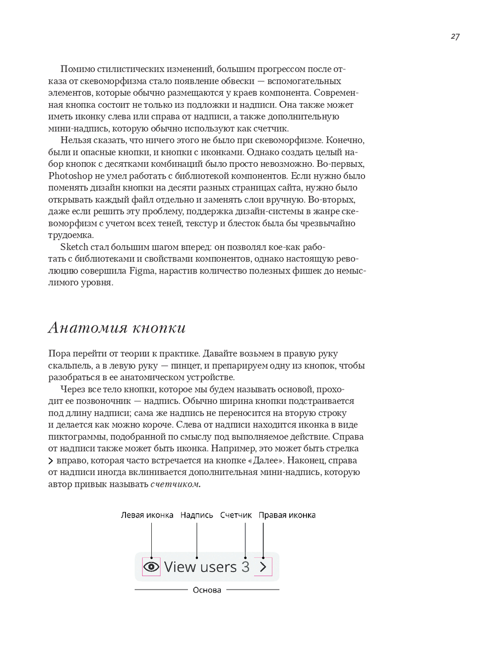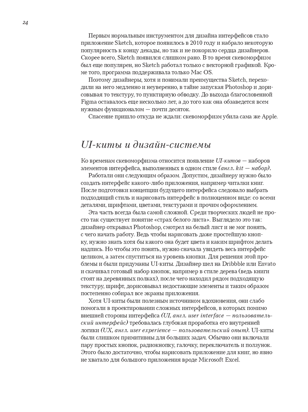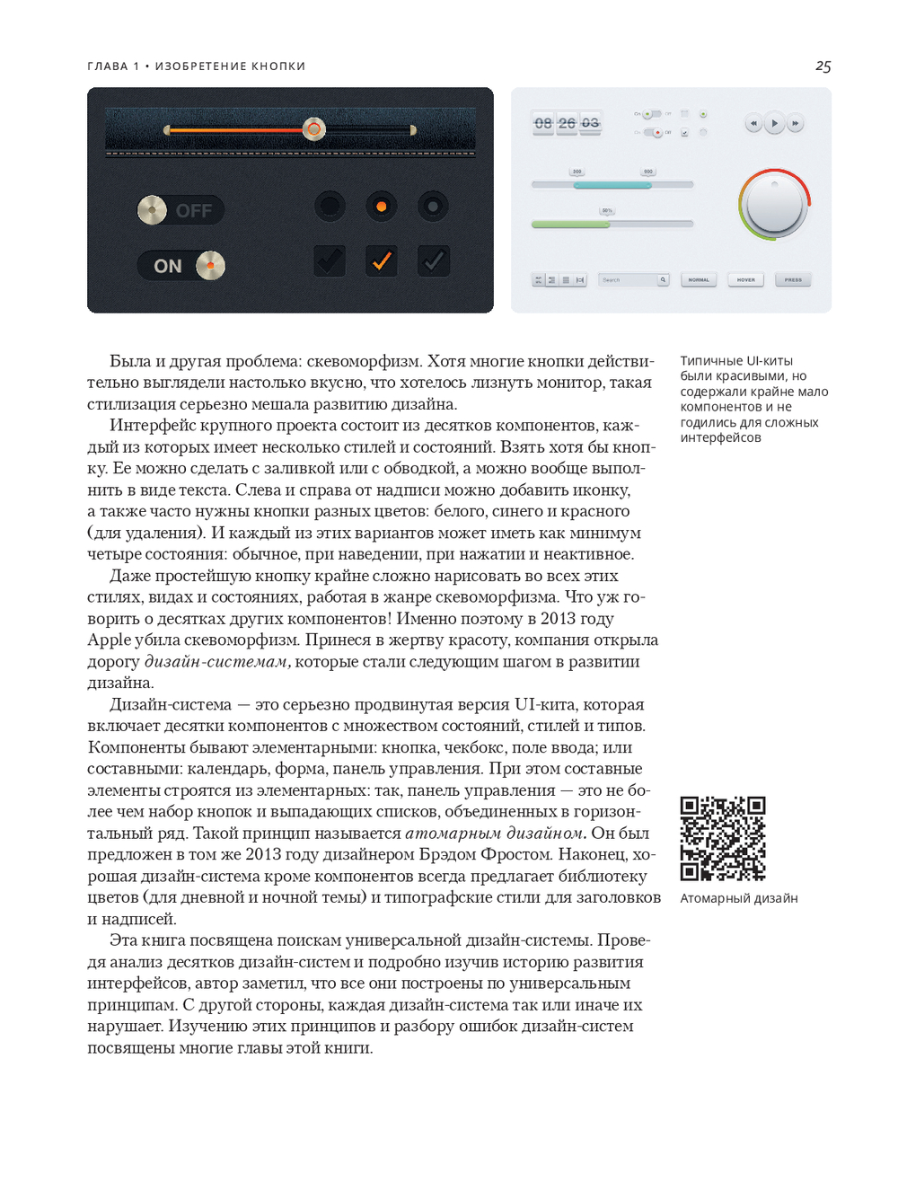 Автор разбирает каждый элемент одновременно "вблизи" (анатомия, варианты, состояния, контекст применения) и "с высоты" (эволюция решений от железа к цифровому миру, перенос между платформами, влияние инструментов – от Photoshop/Sketch к Figma). История превращается в систему, а система – в ускоритель ваших продуктовых решений.