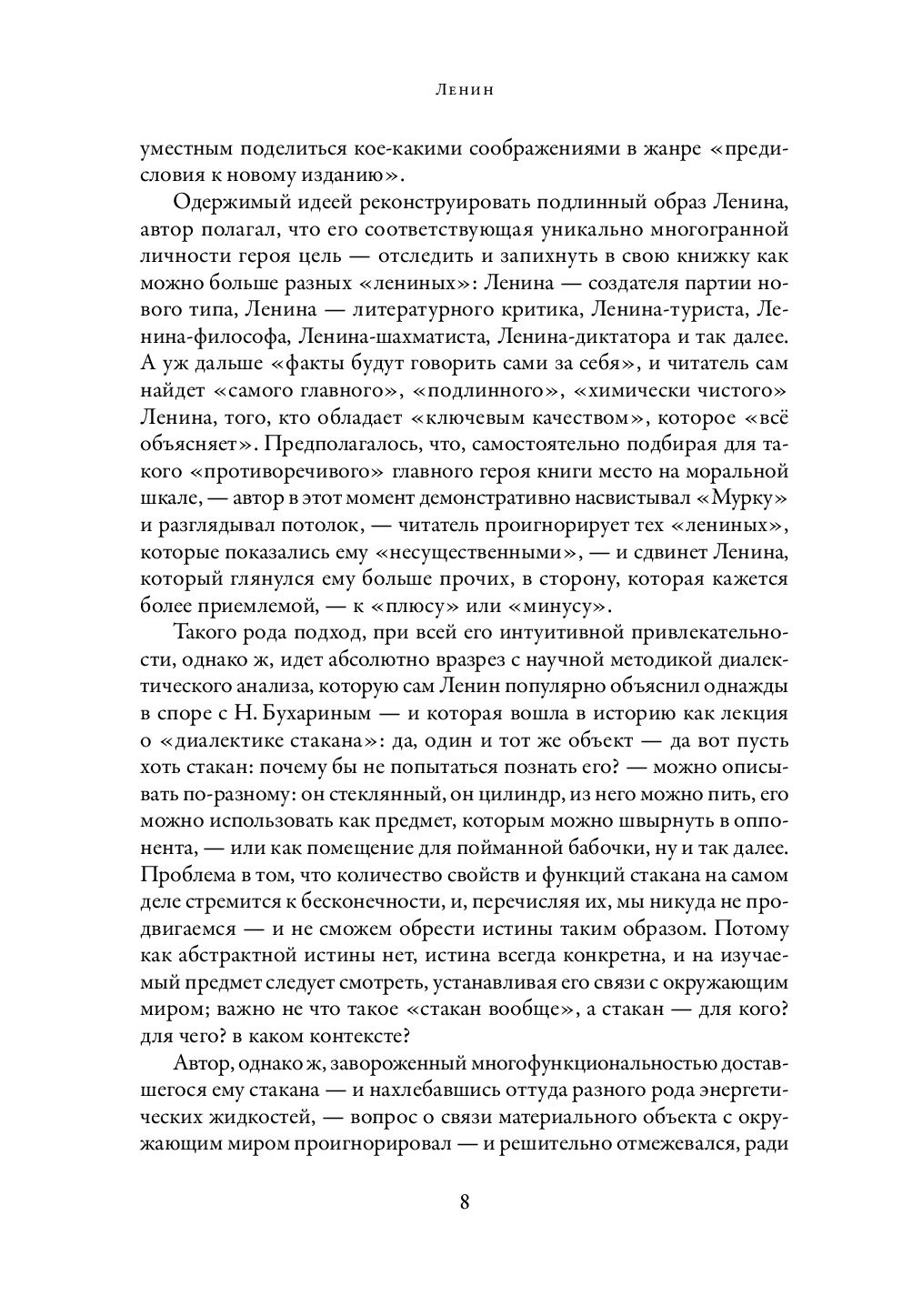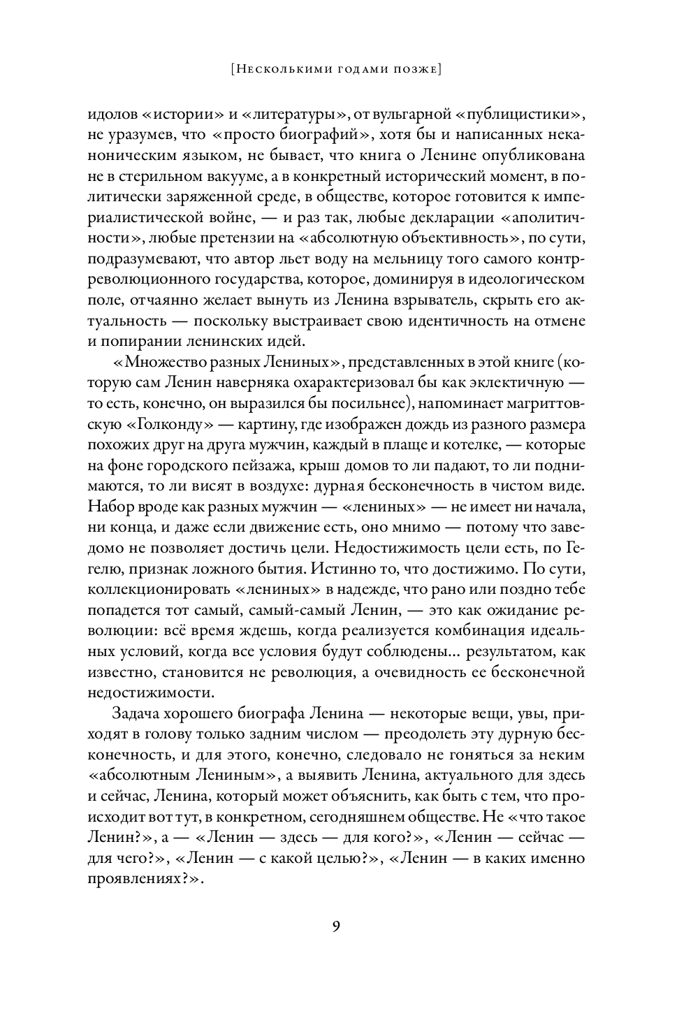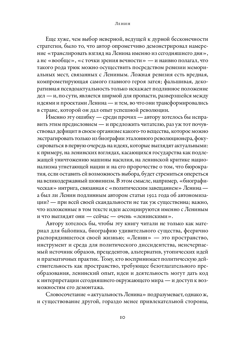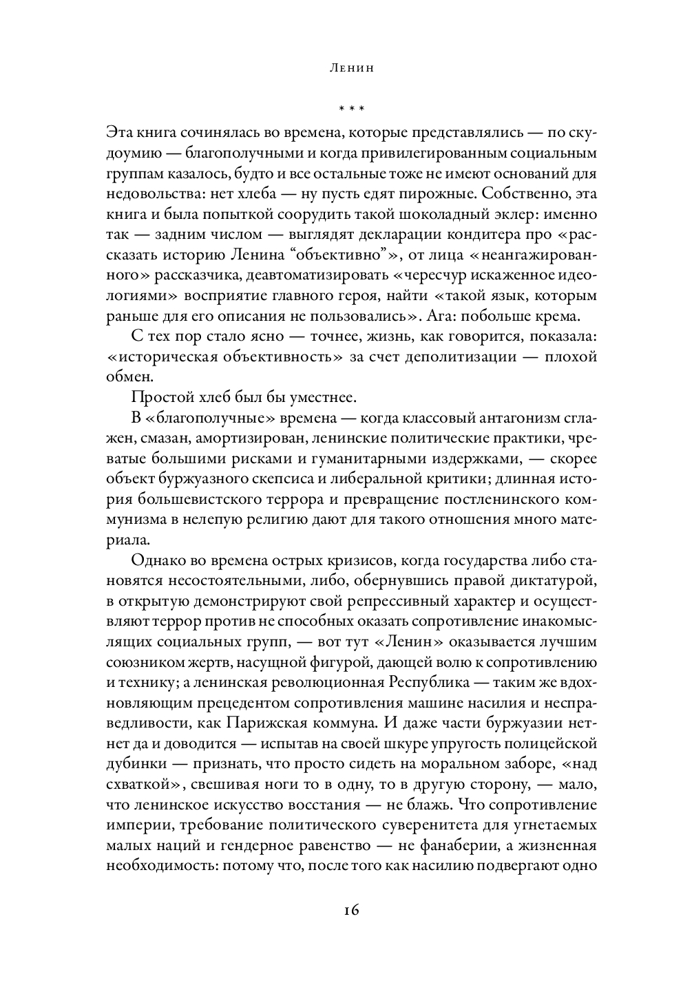 Полная биография В. И. Ленина (1870-1924) представляет собой ревизию ленинских текстов, поступков, партнерств, конфликтов – и не в последнюю очередь "ленинских мест". Автор методично следует за философом-изгоем, сумевшим изменить мир и оказаться на вершине социальной иерархии: от Шушенского до Капри, от "Что делать?" до "Государства и революции", от подполья до Кремля. Читатель, узнавший, как распорядился своей жизнью тот, кто еще сто лет назад казался "живее всех живых", а в современной контрреволюционной России стал мертвее всех мертвых, увидит, что "Ленин" – больше, чем сумма исторических событий: пространство, инструмент и среда для инакомыслия; неисчерпаемый источник образов, прецедентов, альтернатив, утопических идей и прагматичных практик; код к расшифровке сегодняшней действительности – и страховка от увязания в дурной бесконечности.