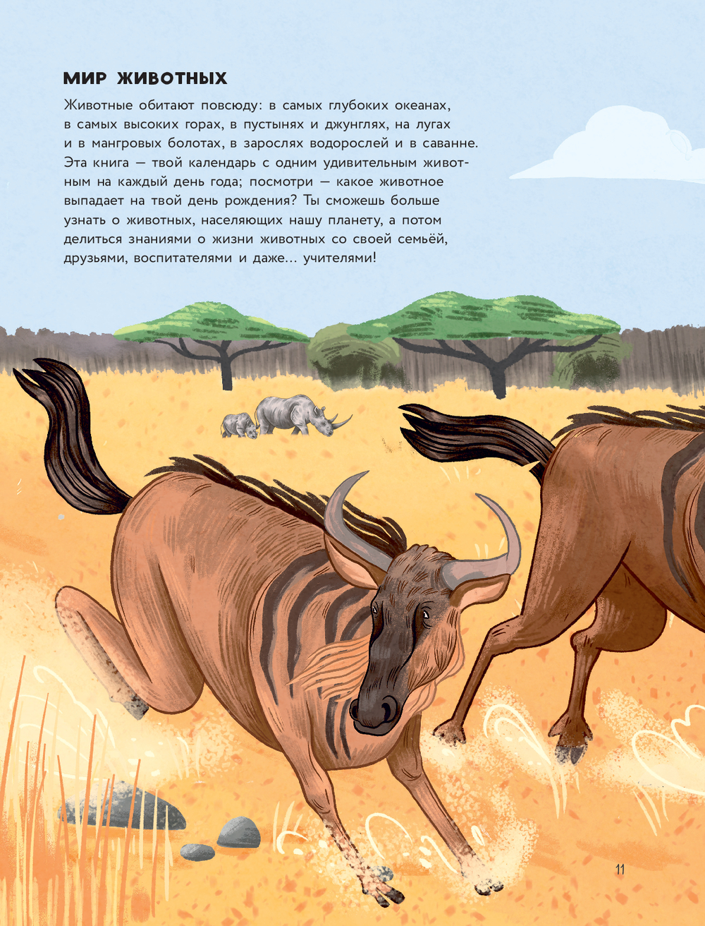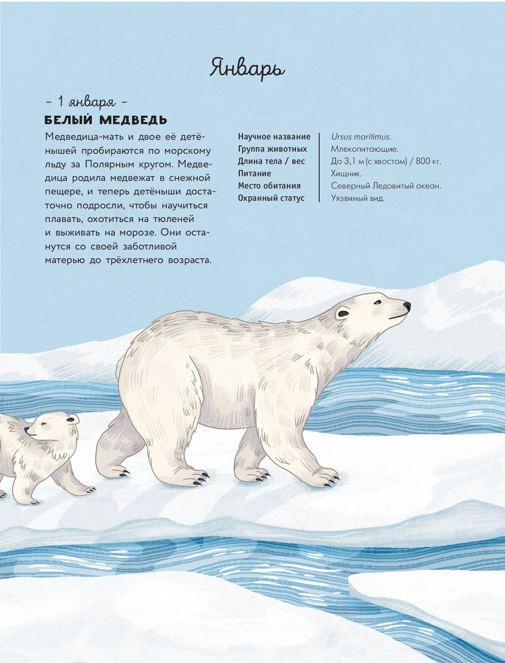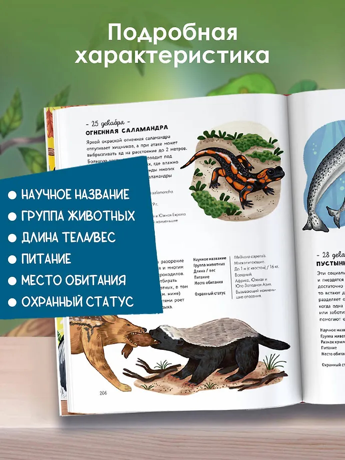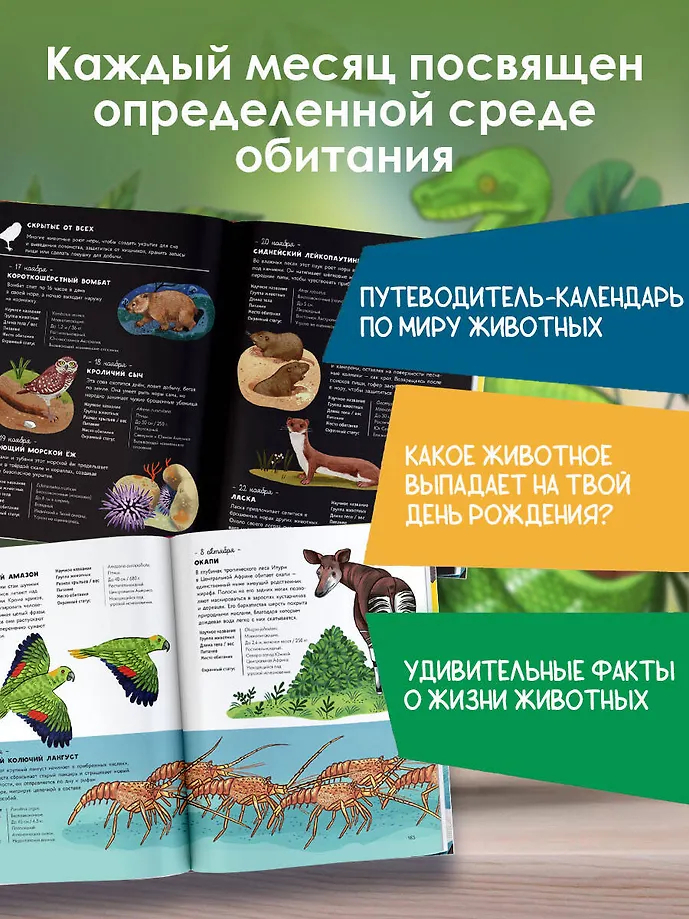 Перед вами красочный путеводитель-календарь по миру животных со всех уголков света: каждый день года посвящён одному животному и удивительным фактам о его жизни. Обитатели саванн, джунглей, пустынь, морей и океанов; звери, птицы, рыбы, рептилии – у каждого свои особенности, о которых вы узнаете на страницах этой книги!