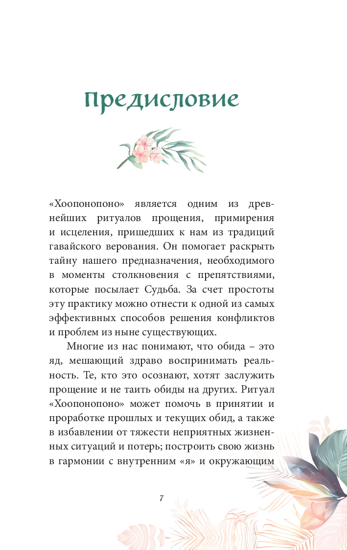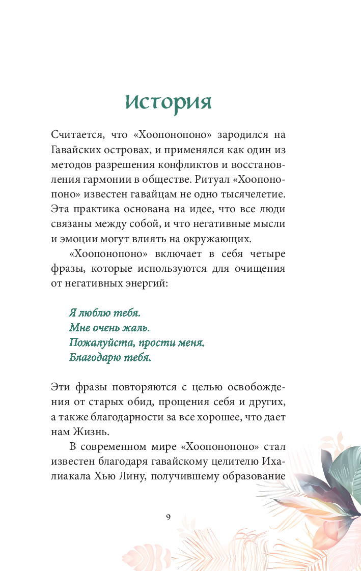 Хоопонопоно – это древние гавайские методы обретения гармонии и внутреннего покоя. Они позволяют легко решать проблемы и трансформировать их в добро. "Мир начинается с тебя!" – гласит гавайская мудрость. Каждый человек несет ответственность за свои собственные поступки и за те события, которые происходят во внешнем мире. Окружающий мир тесно связан с нашим внутренним состоянием, с эмоциями и мыслями. Поэтому, меняя внутренние установки, можно преобразовывать мир вокруг.