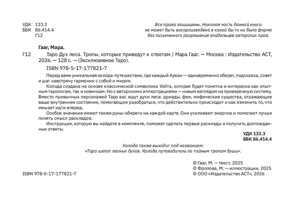Колода также выходит под названием: "Таро шепот лесных духов. Колода путеводитель по тайным тропам души".
