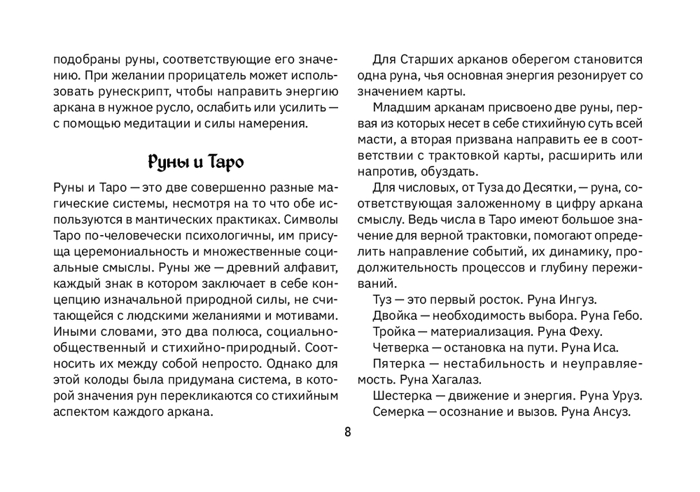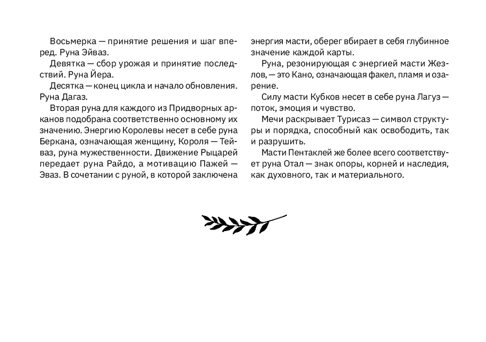 Особая фишка колоды – руны-обереги на каждой карте: они усиливают энергию Арканов и помогают глубже уловить смысл карт. Эта колода – не только для предсказаний, она может стать вашим маленьким помощником: для защиты, духовного развития и гармонии.