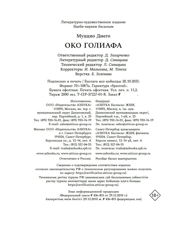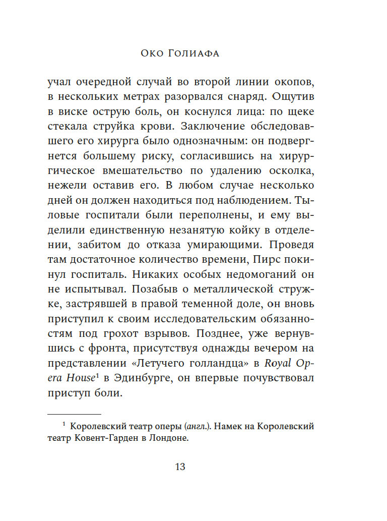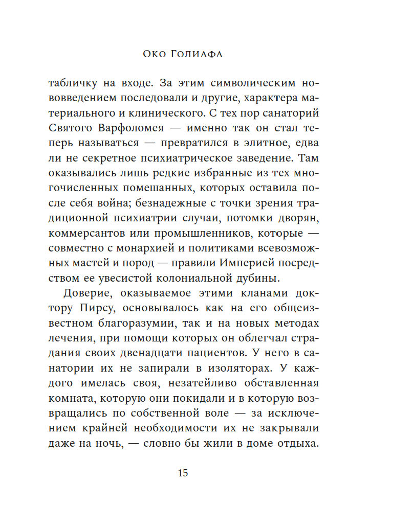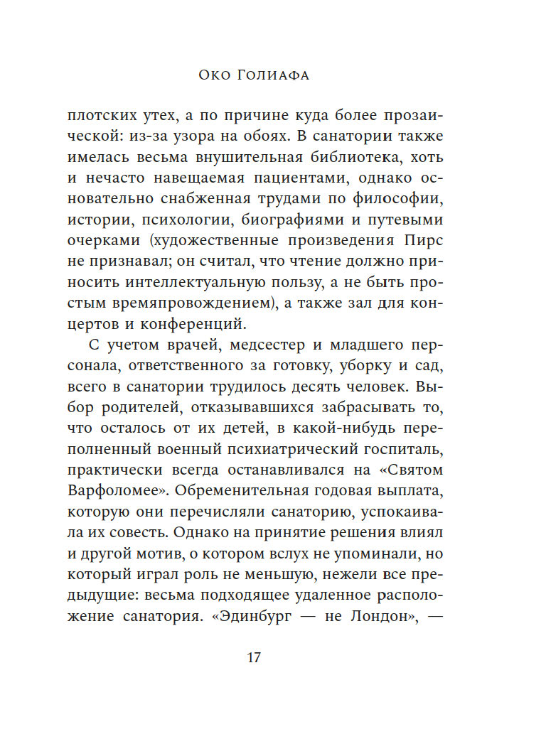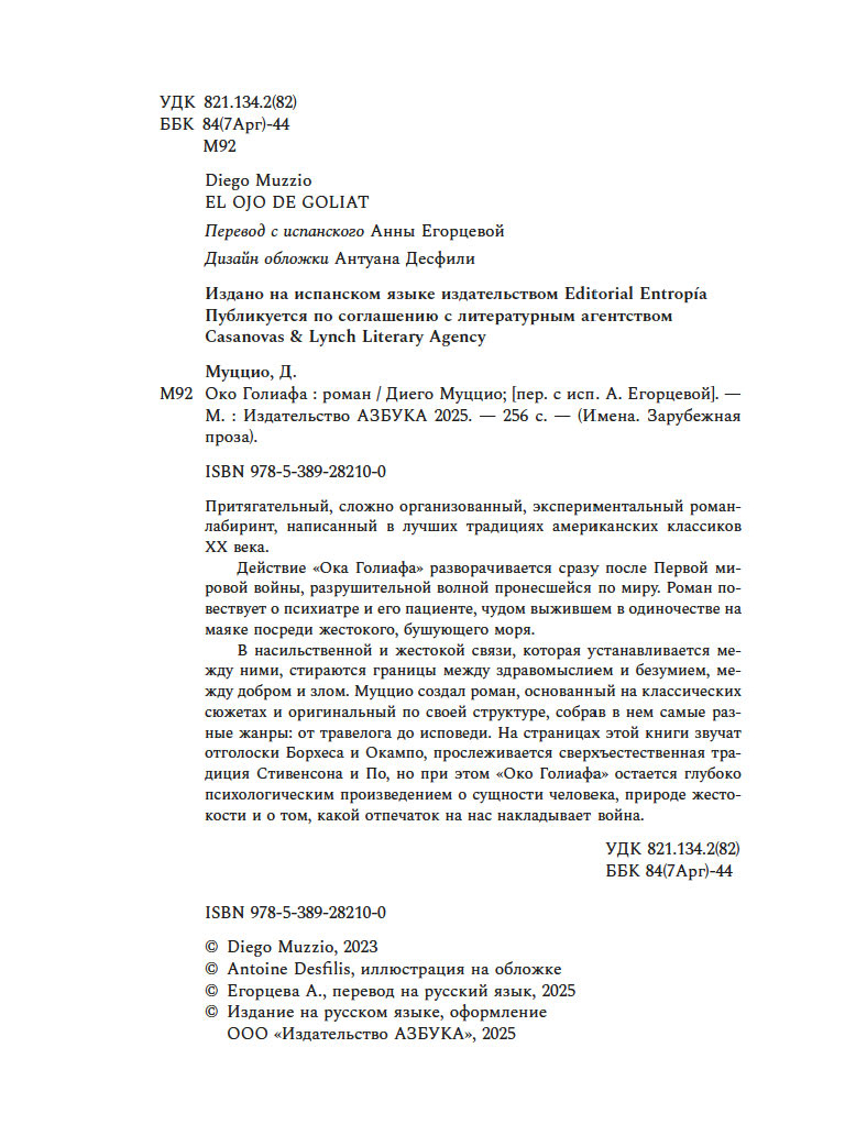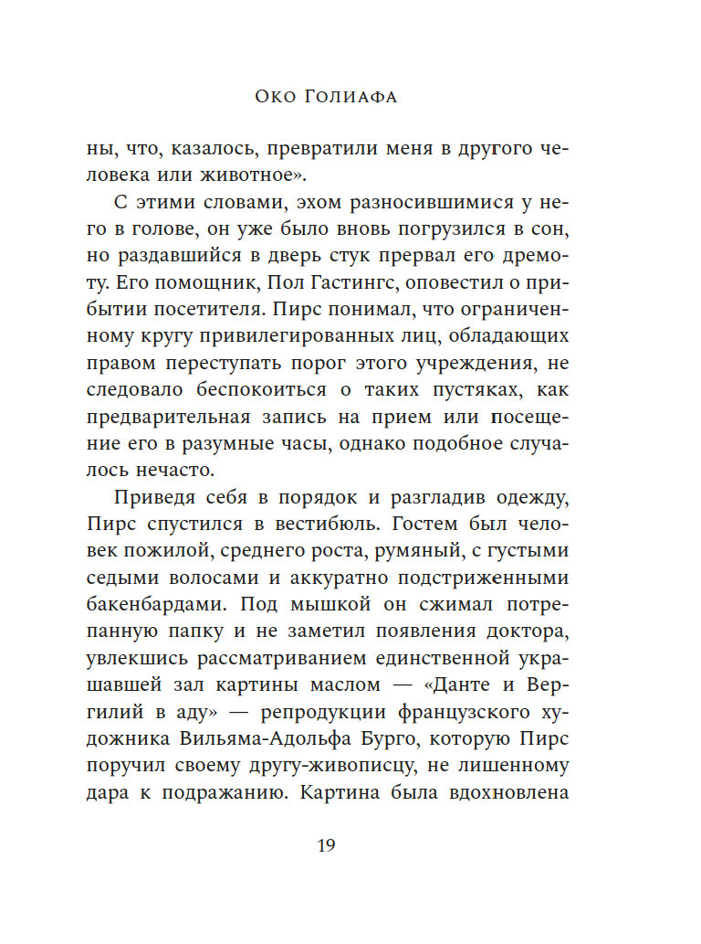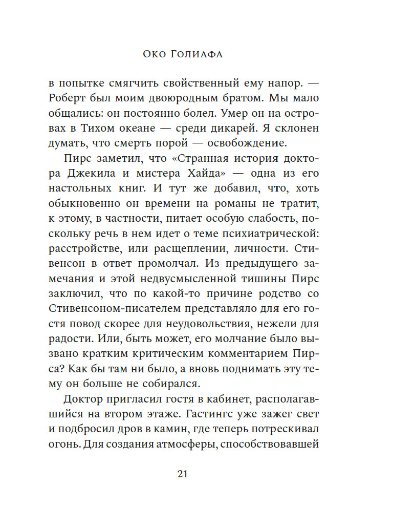 В насильственной и жестокой связи, которая устанавливается между ними, стираются границы между здравомыслием и безумием, между добром и злом. Муццио создал роман, основанный на классических сюжетах и оригинальный по своей структуре, собрав в нем самые разные жанры: от травелога до исповеди. На страницах этой книги звучат отголоски Борхеса и Окампо, прослеживается сверхъестественная традиция Стивенсона и По, но при этом "Око Голиафа" остается глубоко психологическим произведением о сущности человека, природе жестокости и о том, какой отпечаток на нас накладывает война.