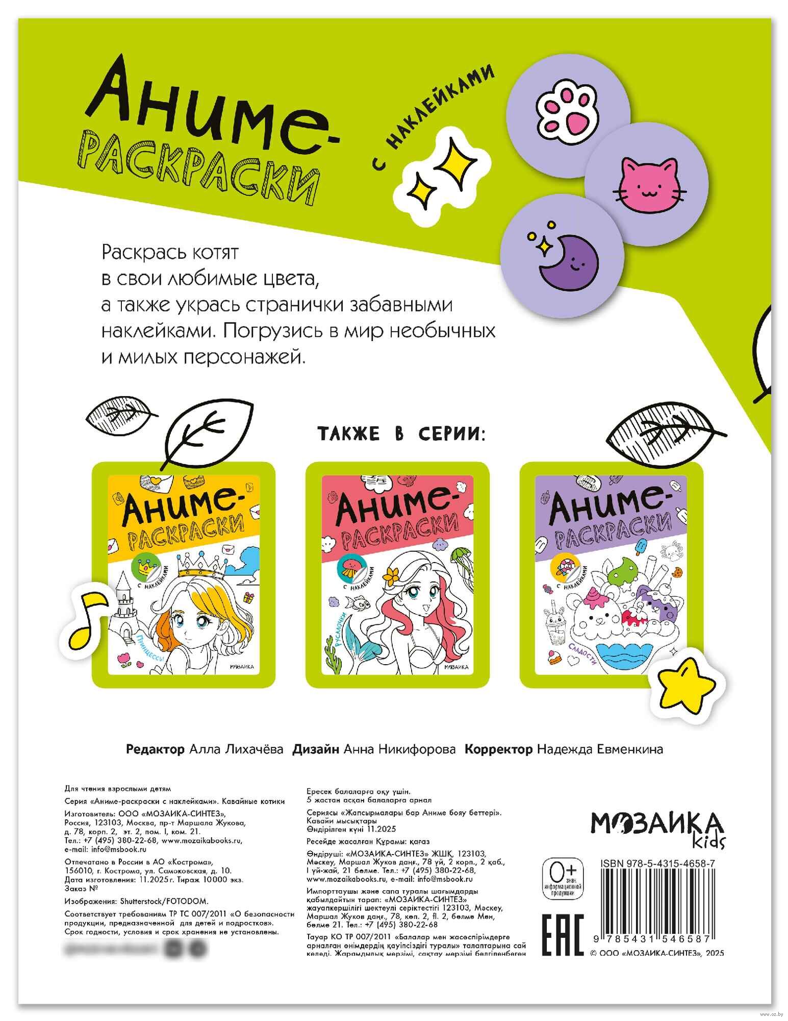 Книга "Кавайные котики" из серии "Аниме-раскраски с наклейками" позволит погрузиться в мир веселых и милых котиков. Ребенок не только сможет раскрасить их в свои любимые цвета, но и украсить странички забавными и яркими наклейками.