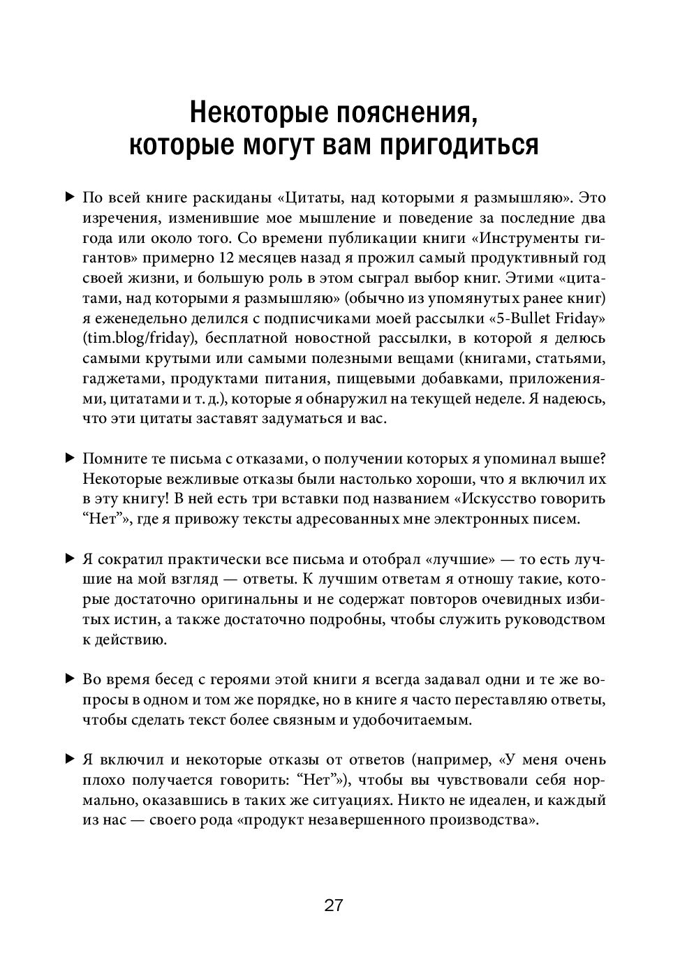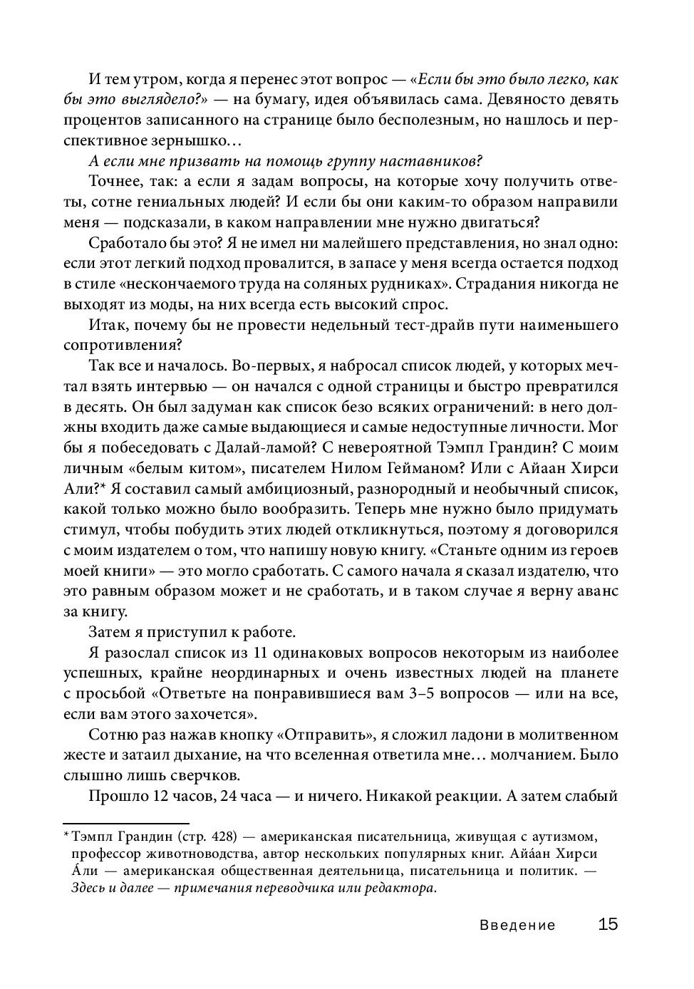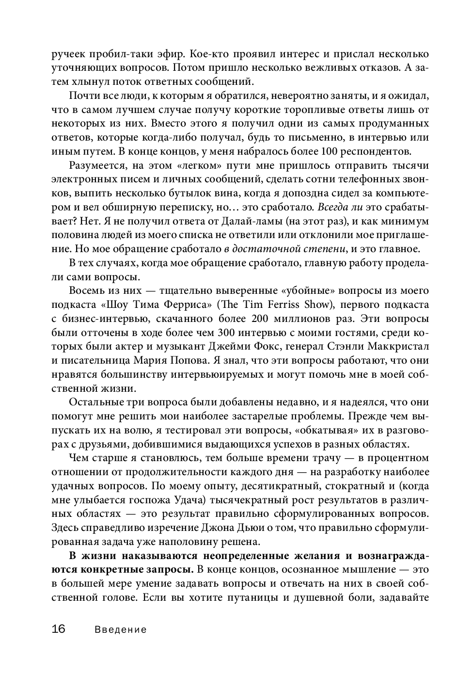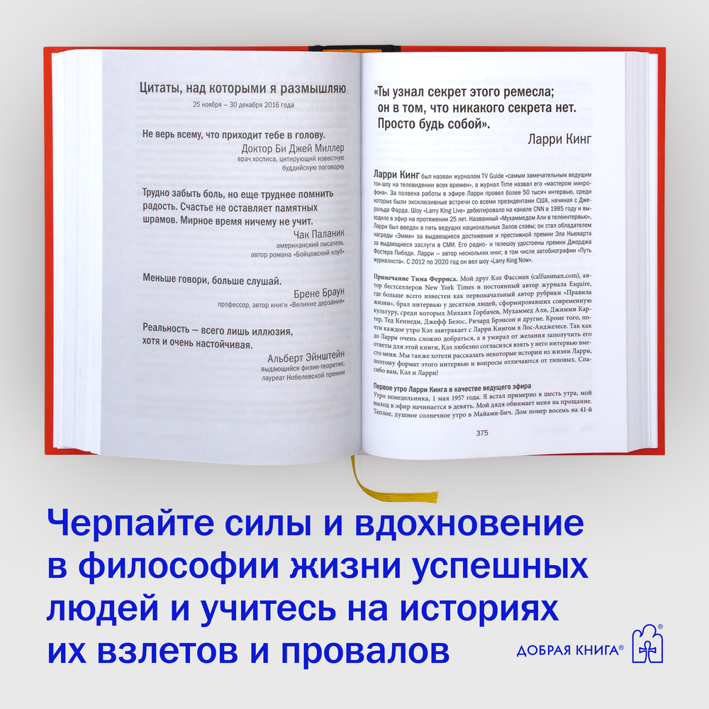 В этой книге, ставшей продолжением бестселлера «Инструменты гигантов», вы найдете концентрированный жизненный опыт более 130 выдающихся людей нашего времени, от успешных предпринимателей и спортсменов мирового класса до всемирно известных писателей и звезд шоу-бизнеса.