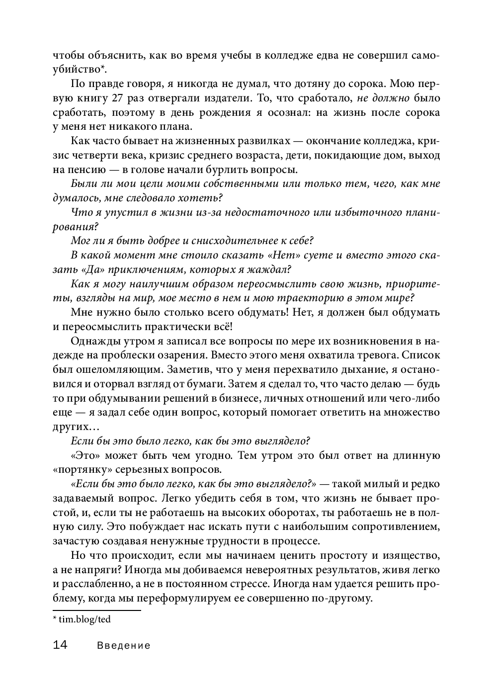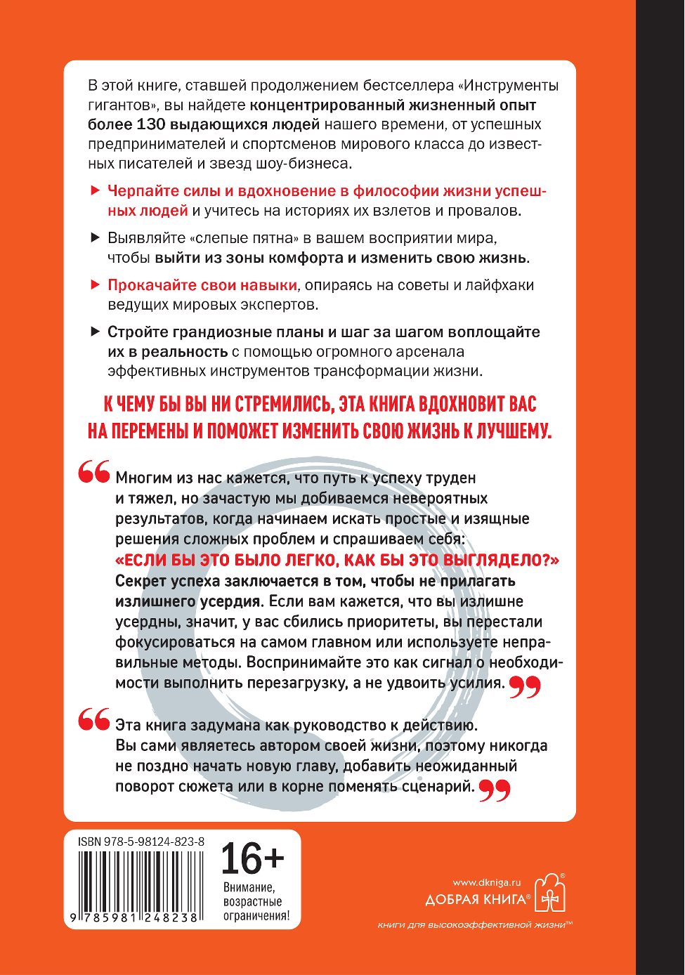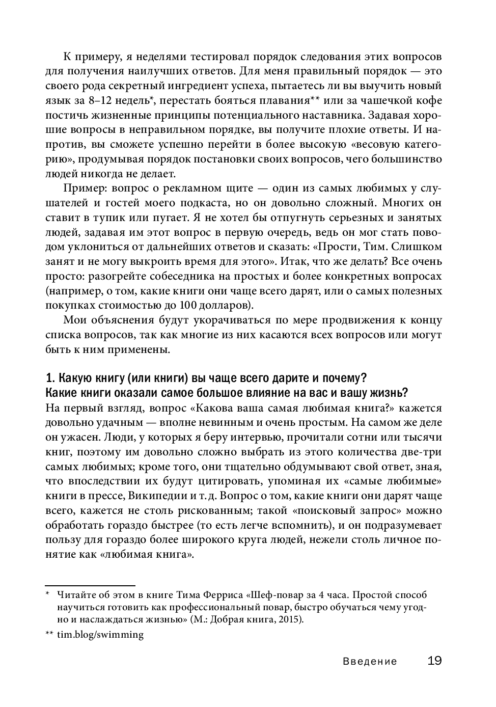 В этой книге, ставшей продолжением бестселлера «Инструменты гигантов», вы найдете концентрированный жизненный опыт более 130 выдающихся людей нашего времени, от успешных предпринимателей и спортсменов мирового класса до всемирно известных писателей и звезд шоу-бизнеса.