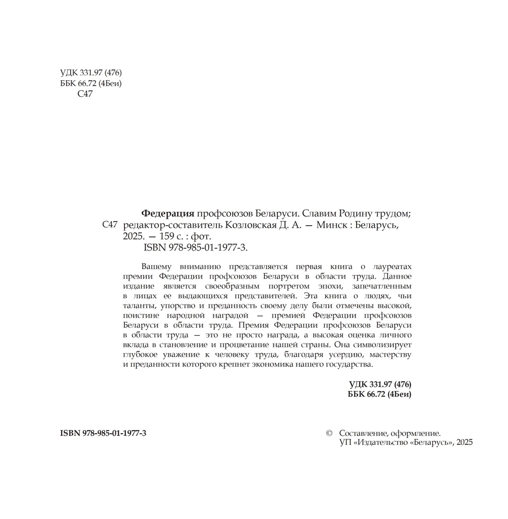 Вашему вниманию представляется первая книга о лауреатах премии Федерации профсоюзов Беларуси в области труда. Данное издание является своеобразным портретом эпохи, запечатленным в лицах ее выдающихся представителей.
