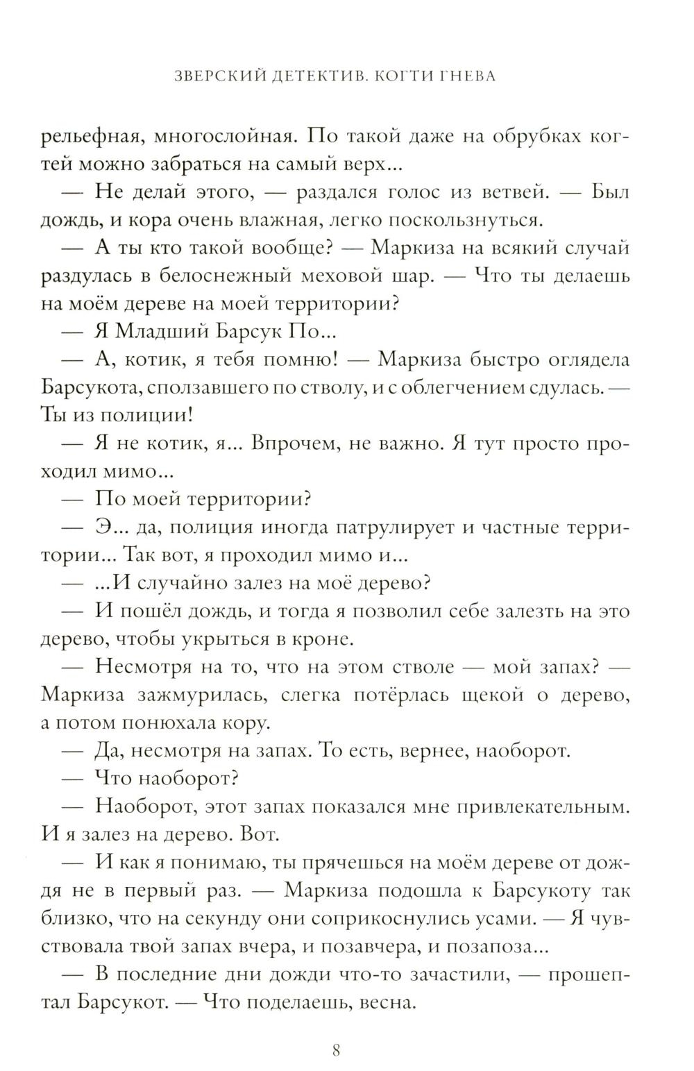 "Когти гнева" – продолжение цикла "Зверский детектив" Анны Старобинец, в который входят также "Логово волка", "Право хищника", "Щипач", "Боги манго", "Хвостоеды" и "Тёмное прошлое. Пальмовый дневник каракала полиции".