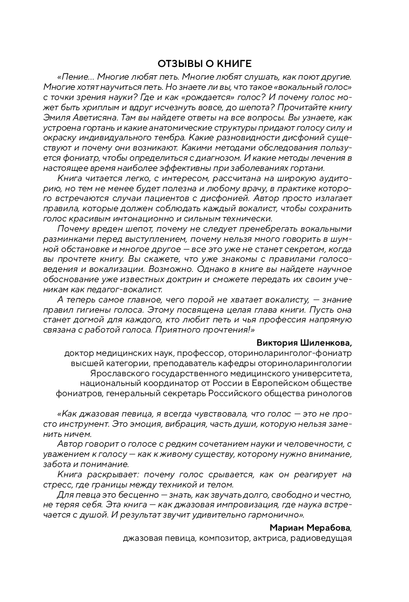 В книге доктора Аветисяна вы найдете практические рекомендации по гигиене голоса, описание типичных ошибок, которые могут ему навредить, а также простые упражнения для снятия напряжения с мышц голосового аппарата.
