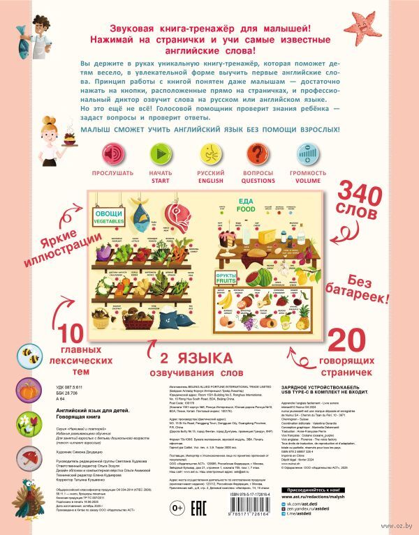 Книга работает без батареек. Издание идеально подходит для первого знакомства ребёнка с иностранным языком.