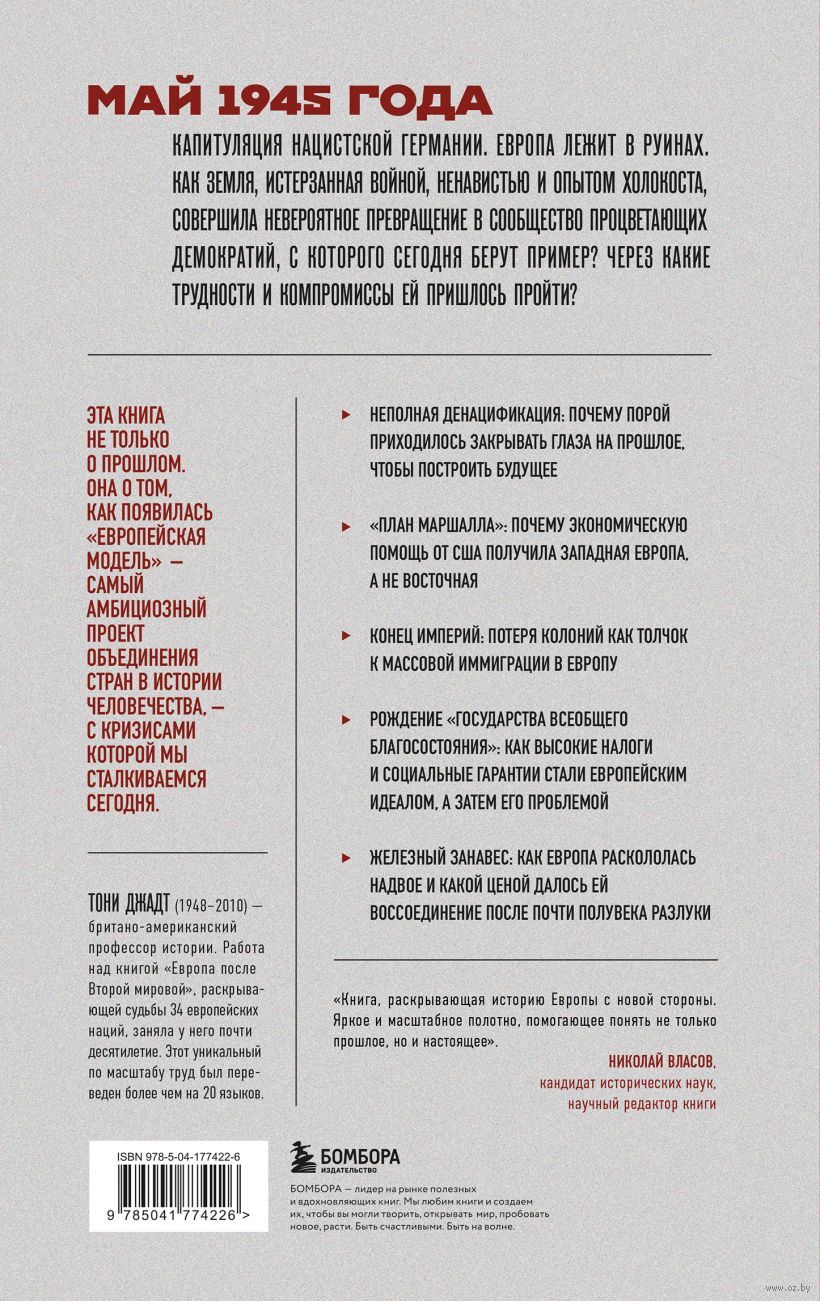 Монография Тони Джадта – комплексный анализ трансформации Европы после 1945 года: ее путь от послевоенной разрухи к процветающему сообществу демократий. В книге исследуются ключевые факторы этого перехода – план Маршалла, становление государства всеобщего благосостояния, процессы денацификации и деколонизации, геополитический раскол и последующее воссоединение континента. Особое внимание уделено уникальной "европейской модели" интеграции, ее достижениям и современным вызовам.