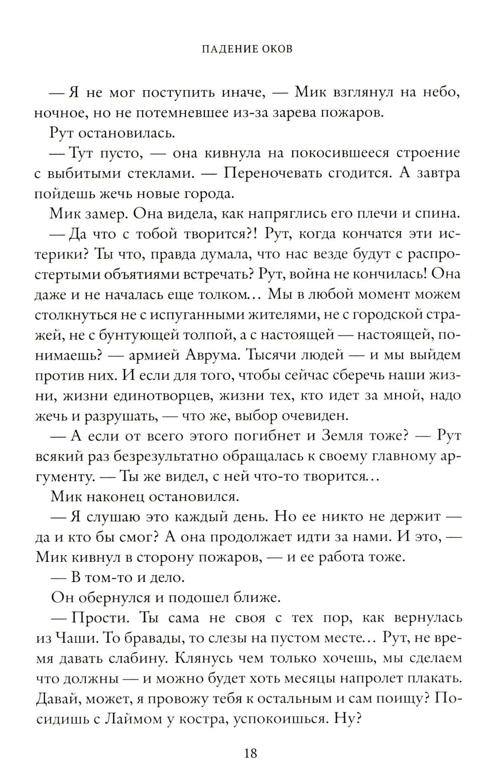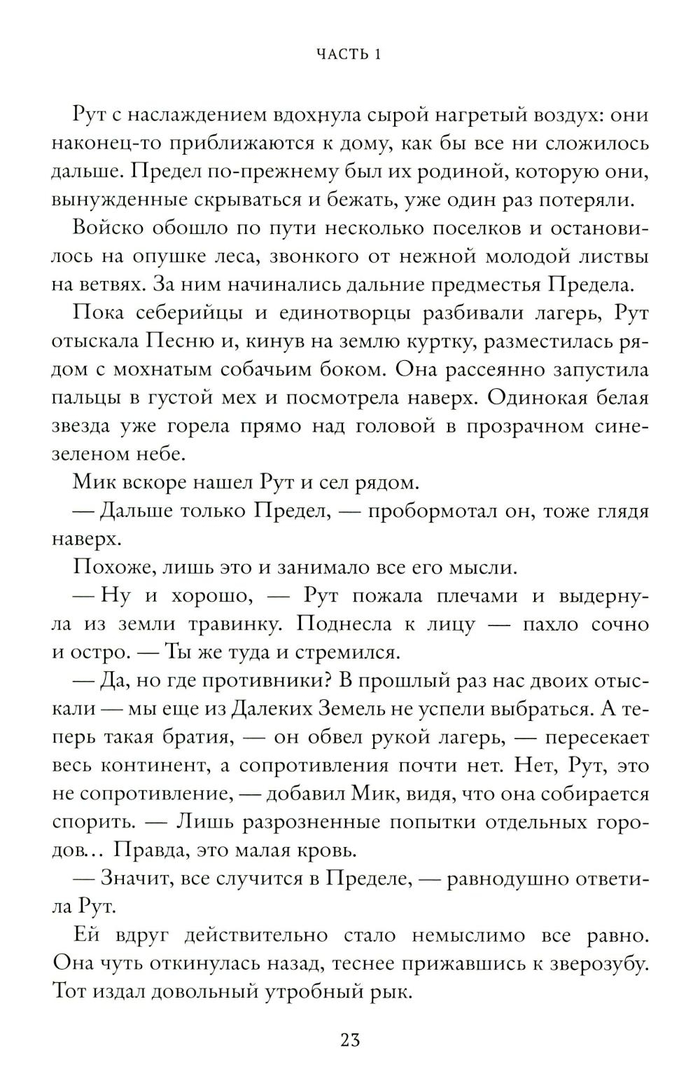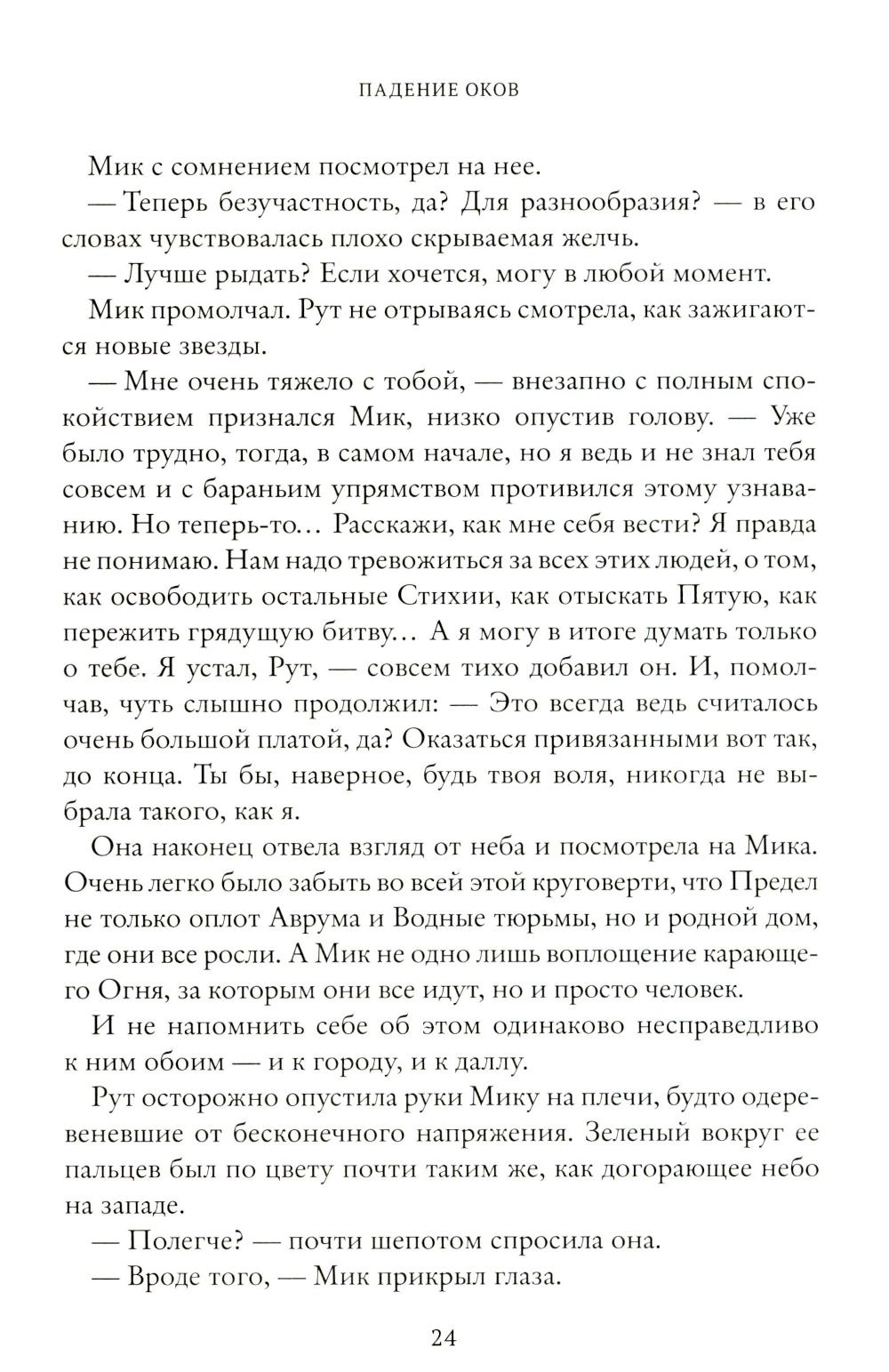 Все это надломило миролюбивую Рут. Ее отношения с Миком раскалены: она видит в нем только яростный карающий Огонь. Предел впускает мятежников, но он почти пуст: ни стражников, ни армии Аврума, ни сопротивления. Зато здесь герои наконец встретятся с Каем и Бартеном и узнают, что Дарина в плену у Воздуха. Конфликт Мика и Кая разгорается с новой силой, а вина последнего за себерийскую бойню становится невыносимой. И тем не менее им нужно продолжать путь вместе: освобождать пленников Тюрем и саму Воду ; искать ушедших на зов , надеясь, что среди них будет и Риккард – и что его сознание еще возможно вернуть.