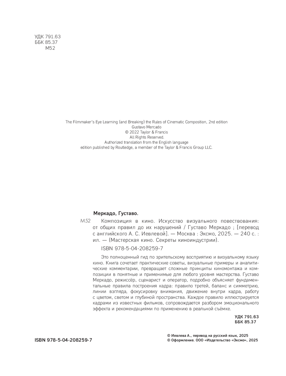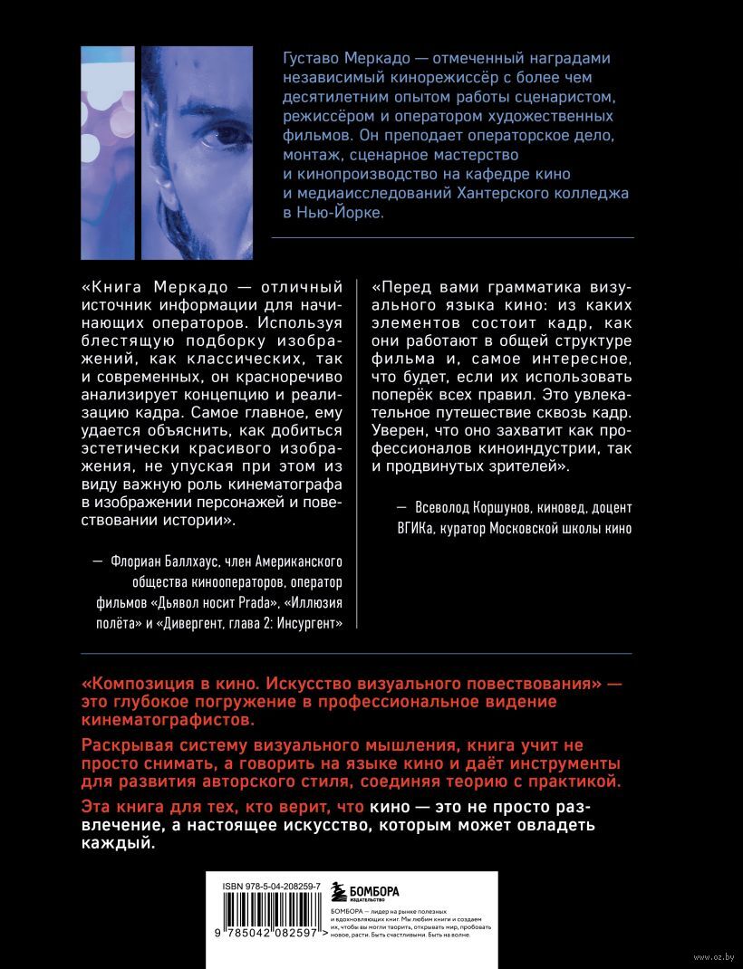 Это полноценный гид по зрительскому восприятию и визуальному языку кино. Книга сочетает практические советы, визуальные примеры и аналитические комментарии, превращает сложные принципы киномонтажа и композиции в понятные и применимые для любого уровня мастерства. Густаво Меркадо, режиссёр, сценарист и оператор, подробно объясняет фундаментальные правила построения кадра: правило третей, баланс и симметрия, линии взгляда, фокусировка внимания, движение внутри кадра, работа с цветом, светом и глубиной пространства. Каждое правило иллюстрируется кадрами из известных фильмов, сопровождается разбором эмоционального эффекта и рекомендациями по применению в реальной съёмке.