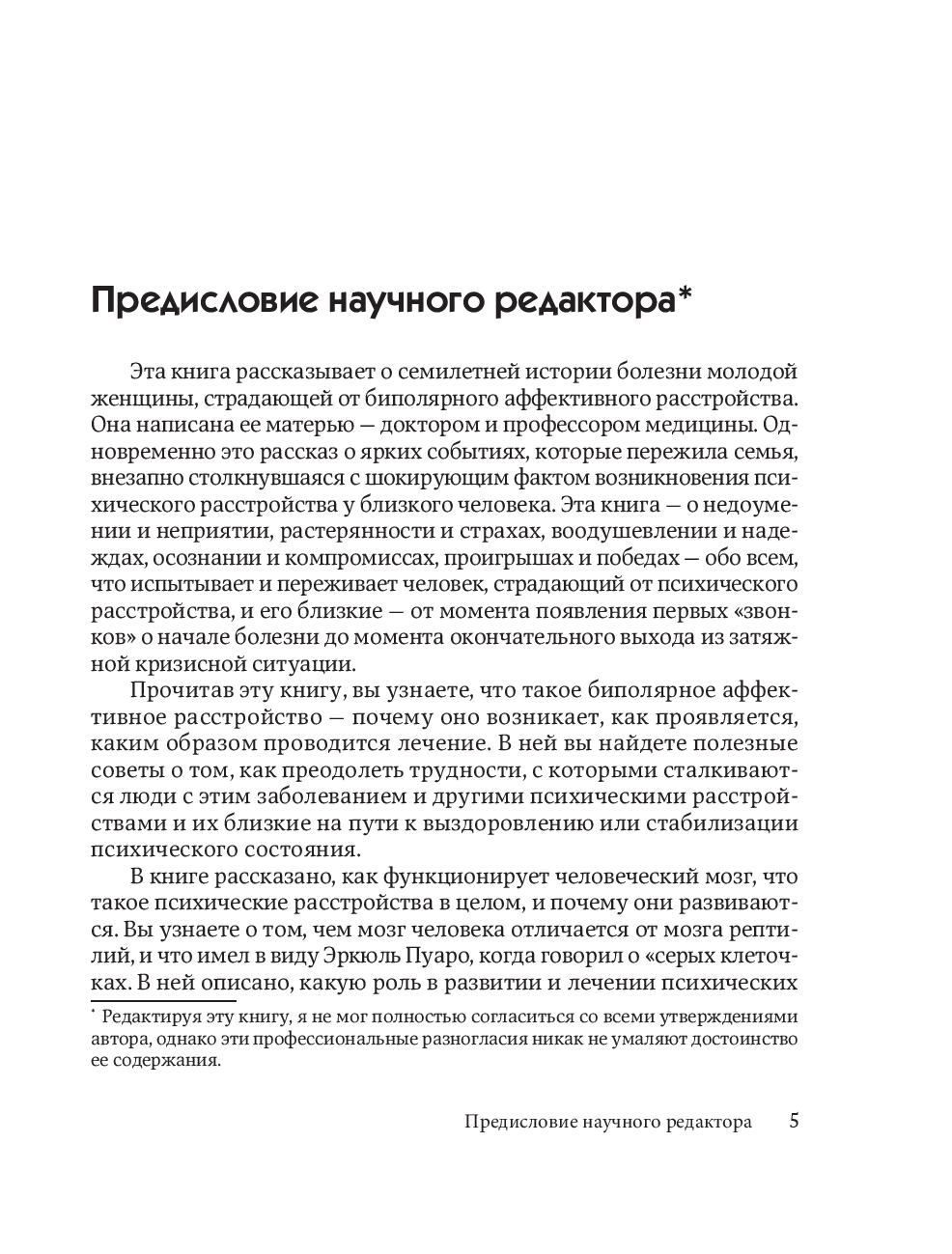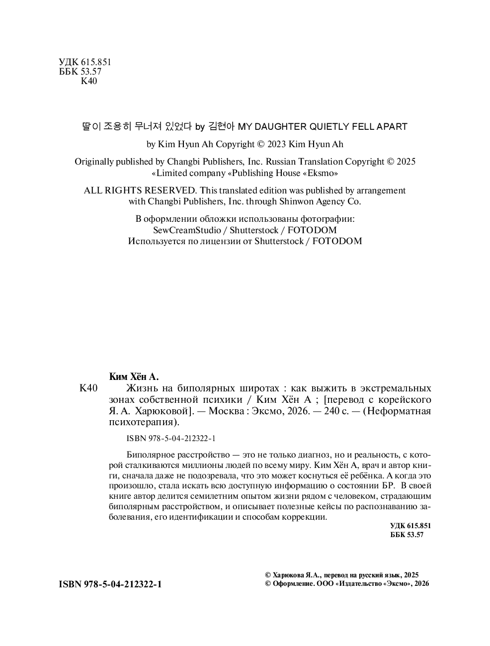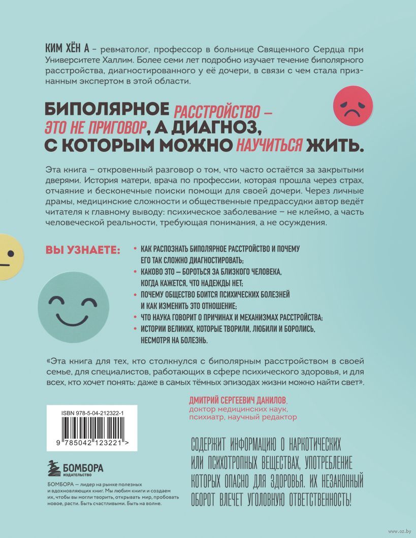 Биполярное расстройство – это не только диагноз, но и реальность, с которой сталкиваются миллионы людей по всему миру. Хёна Ким, врач и автор книги, сначала даже не подозревала, что это может коснуться её ребёнка. А когда это произошло, стала искать всю доступную информацию о состоянии БР. В своей книге автор делится семилетним опытом жизни рядом с человеком, страдающим биполярным расстройством, и описывает полезные кейсы по распознаванию заболевания, его идентификации и способам коррекции.