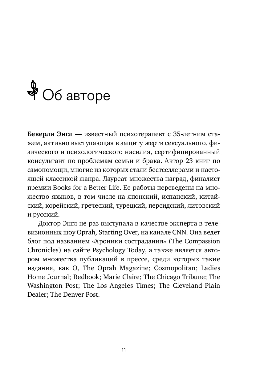 Беверли Энгл – психотерапевт с более чем 35-летним опытом и специалист по работе с жертвами насилия. Она написала множество книг о травме, стыде и восстановлении. За ее плечами не только научные исследования, но и десятки тысяч часов терапии с реальными людьми. С теми, кто преодолел насилие и изменил собственное деструктивное поведение.