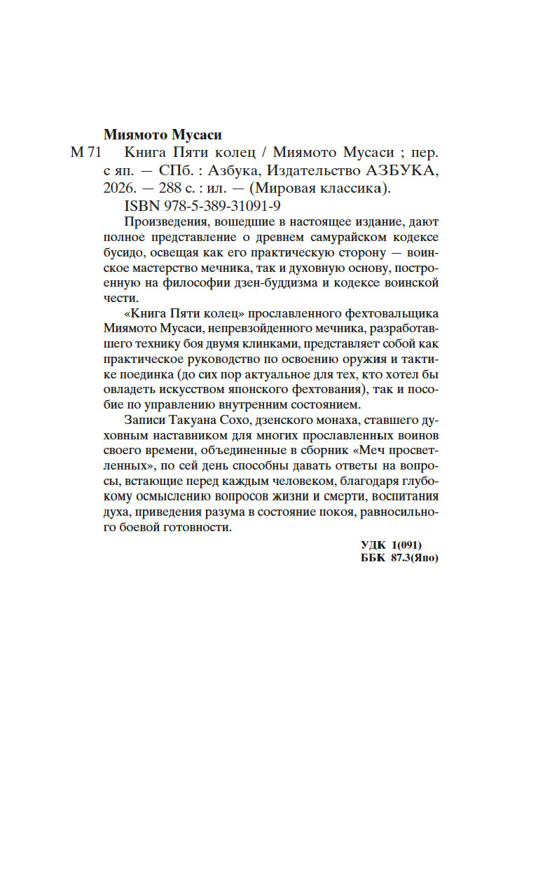 Произведения, вошедшие в настоящее издание, дают полное представление о древнем самурайском кодексе бусидо, освещая как его практическую сторону – воинское мастерство мечника, так и духовную основу, построенную на философии дзен-буддизма и кодексе воинской чести.