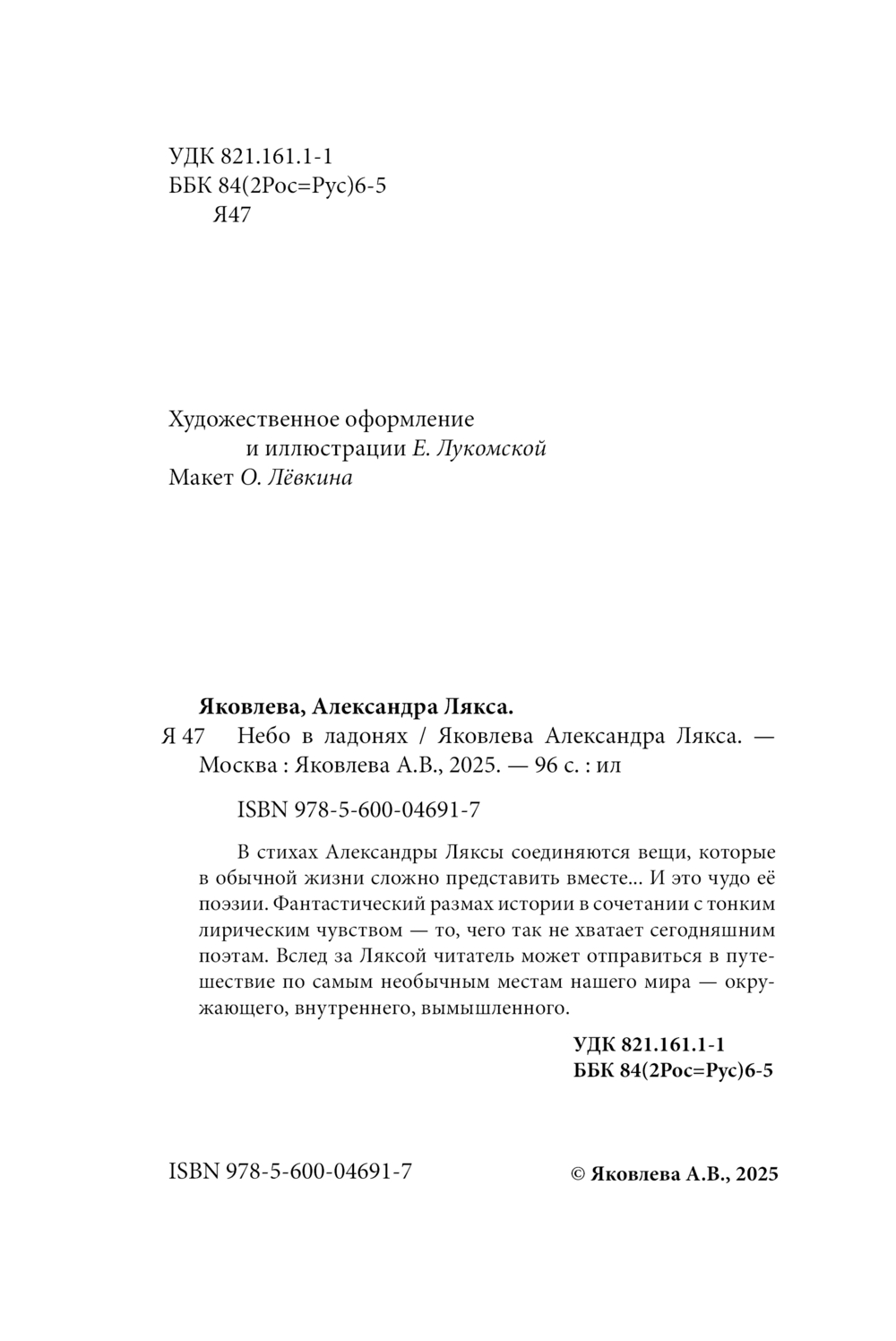 В стихах Александры Ляксы соединяются вещи, которые в обычной жизни сложно представить вместе... И это чудо её поэзии. Фантастический размах истории в сочетании с тонким лирическим чувством – то, чего так не хватает сегодняшним поэтам. Вслед за Ляксой читатель может отправиться в путешествие по самым необычным местам нашего мира – окружающего, внутреннего, вымышленного.