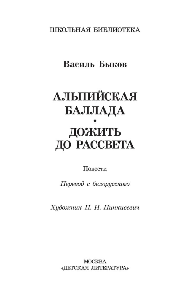 В сборник известного белорусского писателя-фронтовика Василя Быкова (1924–2003) вошли две повести о Великой Отечественной войне – "Альпийская баллада" и "Дожить до рассвета". Обе рассказывают о незаметных, но важных подвигах солдат, защищавших свою страну.