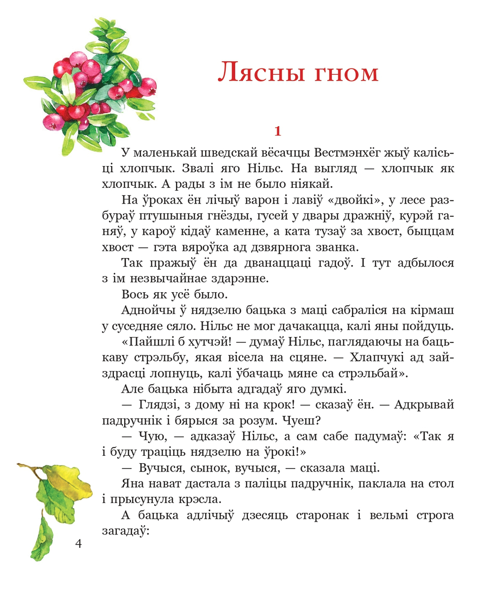 Казачная аповесць вядомай шведскай пісьменніцы, лаўрэата Нобелеўскай прэміі Сельмы Лагерлёф расказвае пра тое, як злы гном ператварыў задзірлівага, непаслухмянага і гультаяватага хлопчыка Нільса Хольгерсана ў малюсень кага чалавечка. Разам з гусінай чарадой Нільс адпраўляецца ў дзівоснае падарожжа па роднай зямлі. Але самае дзіўнае – гэта не проста падарожжа, а цудоўнае ператварэнне Нільса ў сябра звяроў і птушак, у добрага і працавітага хлопчыка. Чытачам прапануецца скарочаны варыянт казачнай гісторыі.
