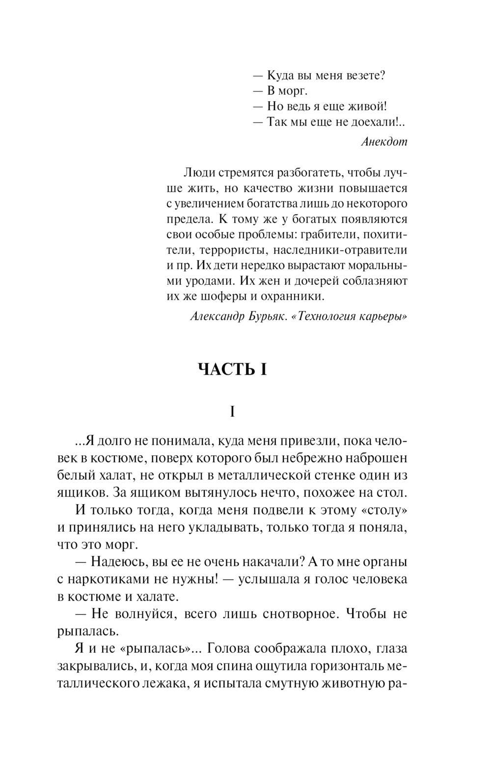 Ослепленная светом, я лишь моргала, когда меня впихнули в дверь, которая тут же закрылась за мной... В подвале я провела больше недели, не зная, зачем я тут и почему. Того парня, который приносил мне еду, я каждый день спрашивала, что будет со мной. И каждый день он отвечал, что меня отпустят. Я верила. Со мной обращались неплохо, вполне вежливо, в чем я видела залог того, что им не нужна моя жизнь. Но вышла я из подвала лишь затем, чтобы очутиться в холодильнике морга... Вот и вся моя жизнь, такая короткая. Потому что сегодня я умру…