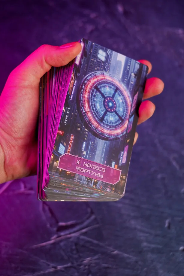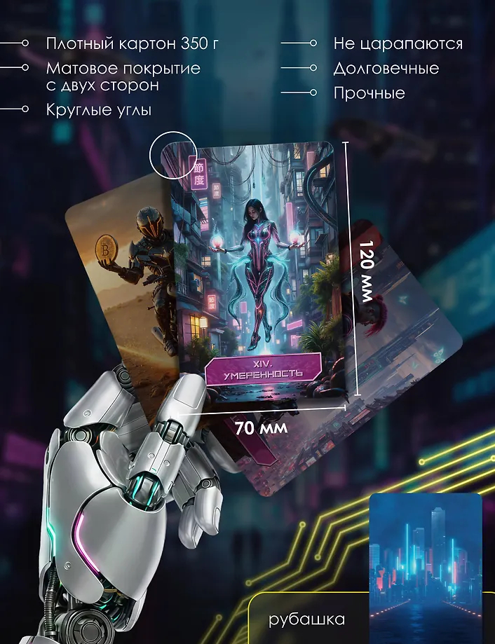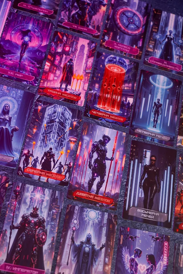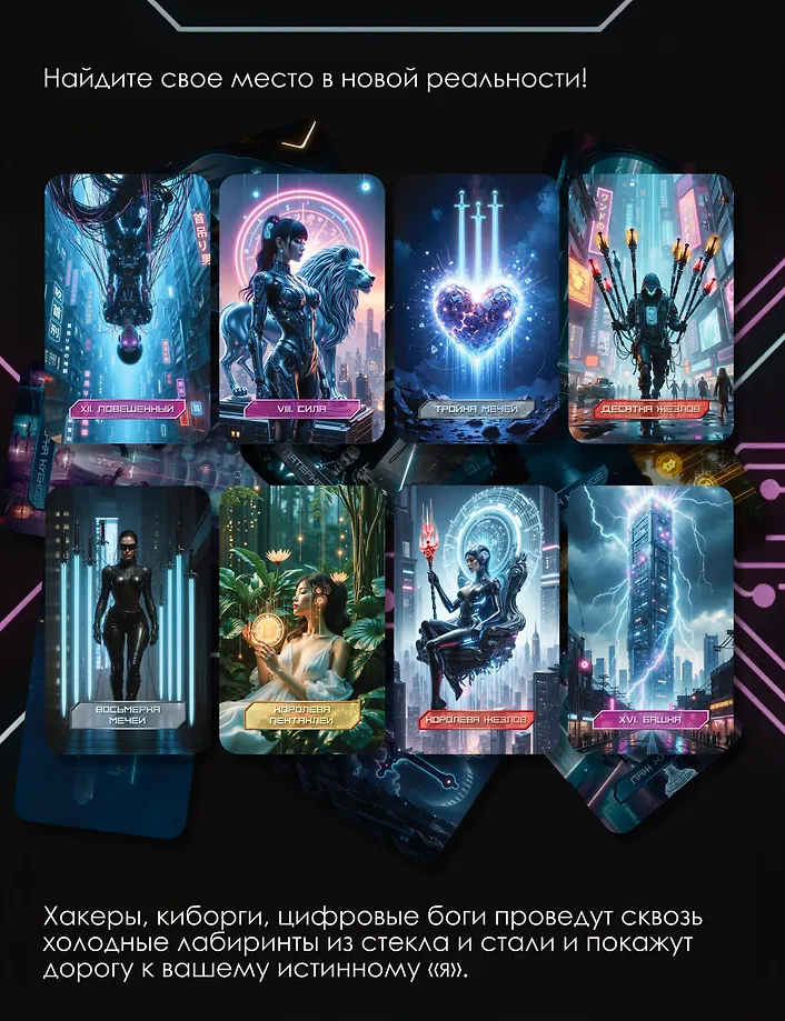 "Кибертаро" – колода, где архетипы классического Таро обретают новую силу в мире технологий. Это уже не просто антиутопическое будущее, а наша реальность. Здесь люди – всего лишь строки кода в гигантской сети, а города – холодные лабиринты из стекла и стали. Таро в этом мире – оружие, канал связи с живым сознанием. Каждый расклад из этой колоды – это шифр, который вам предстоит разгадать. Хакеры, киборги, цифровые боги не боятся выйти за пределы кода. Они проведут сквозь холодные лабиринты из стекла и стали и покажут дорогу к вашему истинному "я".