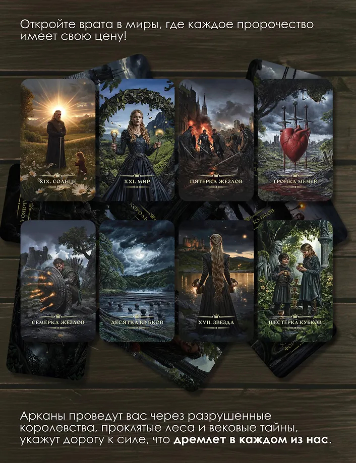 Таро "Темное фэнтези" – колода, в которой архетипы классического Таро обретают плоть в мире, где не утихают войны, не прощаются предательства, а смерть – лишь начало пути. Здесь все пропитано древней магией, горечью потерь и жаждой власти. Арканы проведут вас через разрушенные королевства, проклятые леса и вековые тайны, укажут дорогу к силе, что дремлет в каждом из нас. Придворные фигуры – не просто персонажи: это предатели и герои, ведьмы, правители, изгнанники и охотники на монстров.