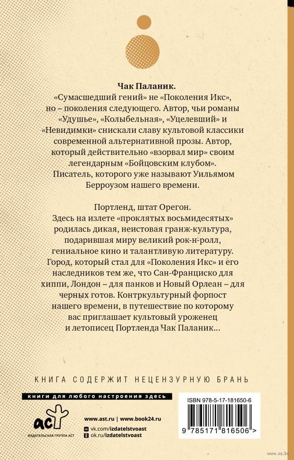 Город, который стал для "поколения Икс" и его наследников тем же, что Сан-Франциско для хиппи, Лондон – для панков и Новый Орлеан для черных готов. Контркультурный форпост нашего времени, в путешествие по которому вас приглашает культовый уроженец и летописец Портленда – Чак Паланик...