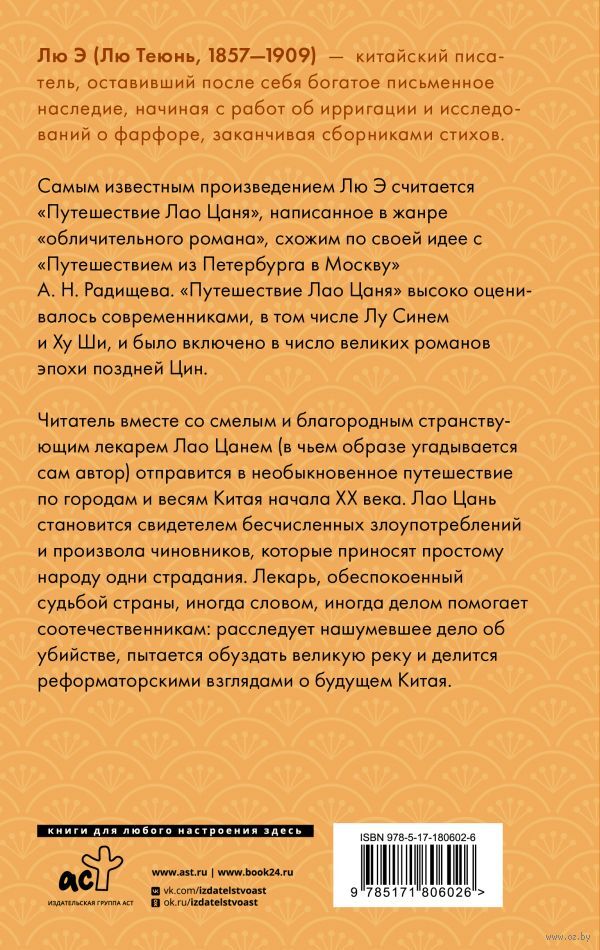 Читатель вместе со смелым и благородным странствующим лекарем Лао Цанем (в чьем образе угадываются сам автор) отправится в необыкновенное путешествие по городам и весям Китая начала XX века. Лао Цань становится свидетелем бесчисленных злоупотреблений и произвола чиновников, которые приносят простому народу одни страдания. Лекарь, обеспокоенный судьбой страны, иногда словом, иногда делом помогает соотечественникам: расследует нашумевшее дело об убийстве, пытается обуздать великую реку и делится реформаторскими взглядами о будущем Китая.