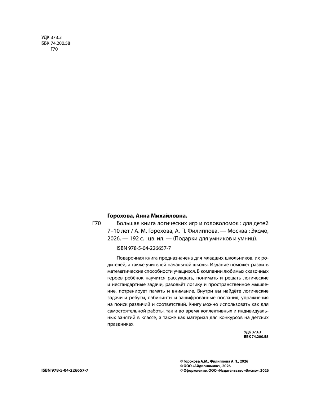 Подарочная книга предназначена для младших школьников, их родителей, а также учителей начальной школы. Издание поможет развить математические способности учащихся. В компании любимых сказочных героев ребёнок научится рассуждать, понимать и решать логические и нестандартные задачи, разовьёт логику и пространственное мышление, потренирует память и внимание. Внутри вы найдёте логические задачи и ребусы, лабиринты и зашифрованные послания, упражнения на поиск различий и соответствий. Книгу можно использовать как для самостоятельной работы, так и во время коллективных и индивидуальных занятий в классе, а также как материал для конкурсов на детских праздниках.