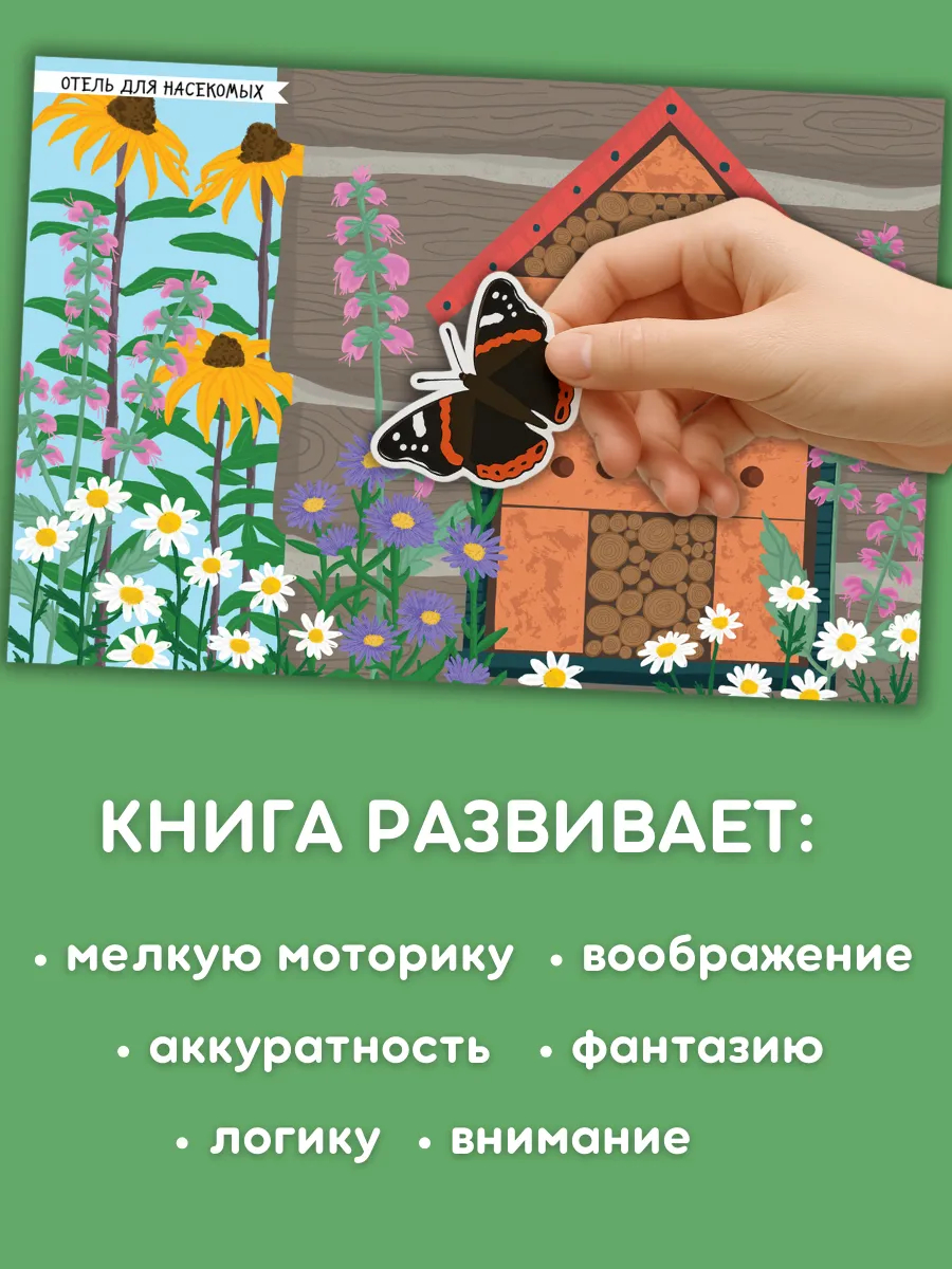 С помощью 13 тематических фонов и более 300 ярких наклеек ребёнок сможет узнать, где обитают насекомые и как они называются. Бабочки, кузнечики, гусеницы, жучки поселятся у пруда, в лесу, на лугу и в саду.