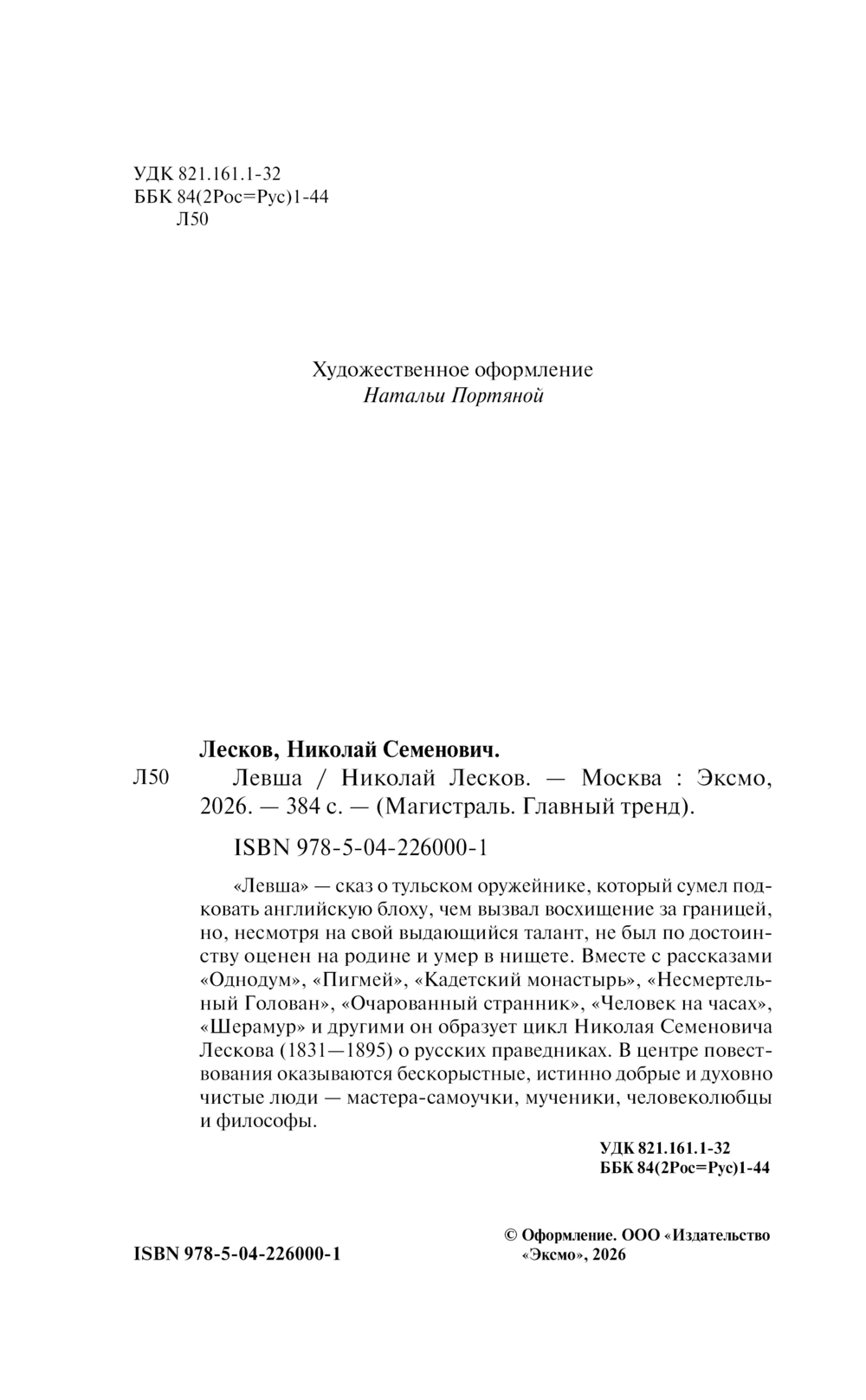 "Левша" – сказ о тульском оружейнике, который сумел подковать английскую блоху, чем вызвал восхищение заграницей, но несмотря на свой выдающийся талант, не был по достоинству оценен на родине и умер в нищете. Вместе с рассказами "Однодум", "Пигмей", "Кадетский монастырь", "Несмертельный Голован", "Очарованный странник", "Человек на часах", "Шерамур" и другими они образуют цикл Николая Семеновича Лескова (1831-1895), о русских праведниках. В центре повествования оказываются бескорыстные, истинно добрые и духовно чистые люди – мастера-самоучки, мученики, человеколюбцы и философы.