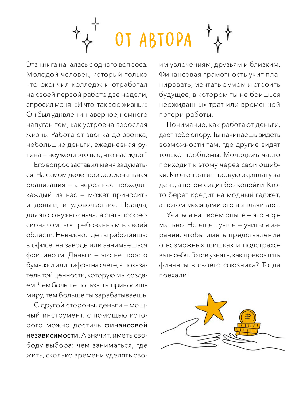 Ребенок узнает, как не стать жертвой мошенников, как выбрать интересную и востребованную профессию, зачем нужно учиться и почему для успеха в финансах важны не богатые родители, а собственные усилия. Он поймет, как самому обеспечивать себя в будущем, научится ответственному отношению к деньгам и сделает первые шаги к финансовой независимости.