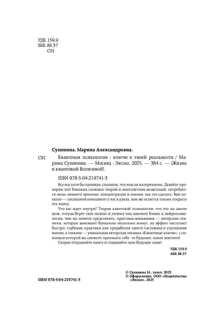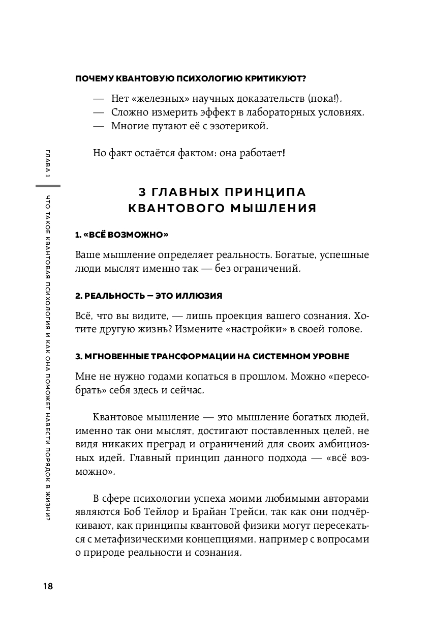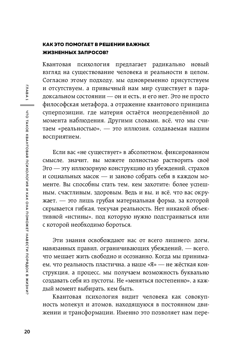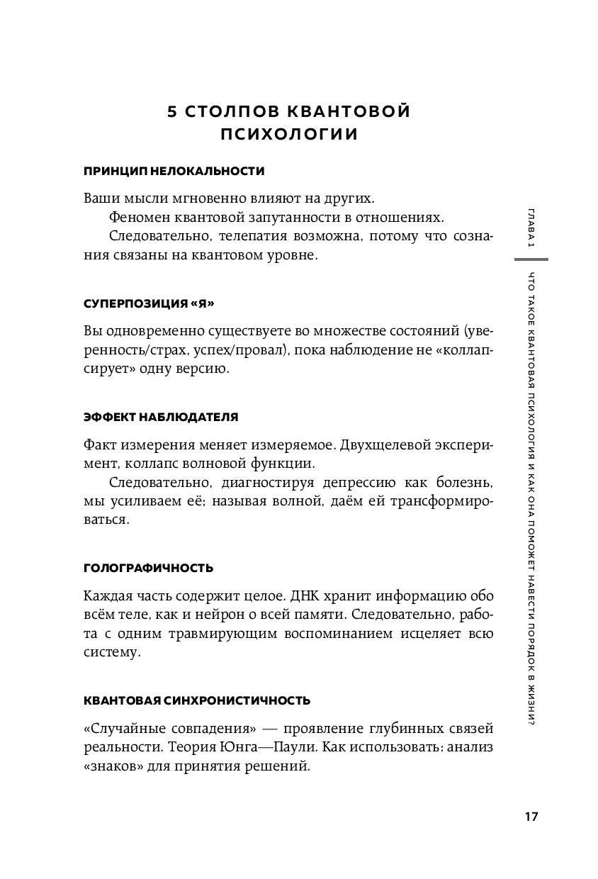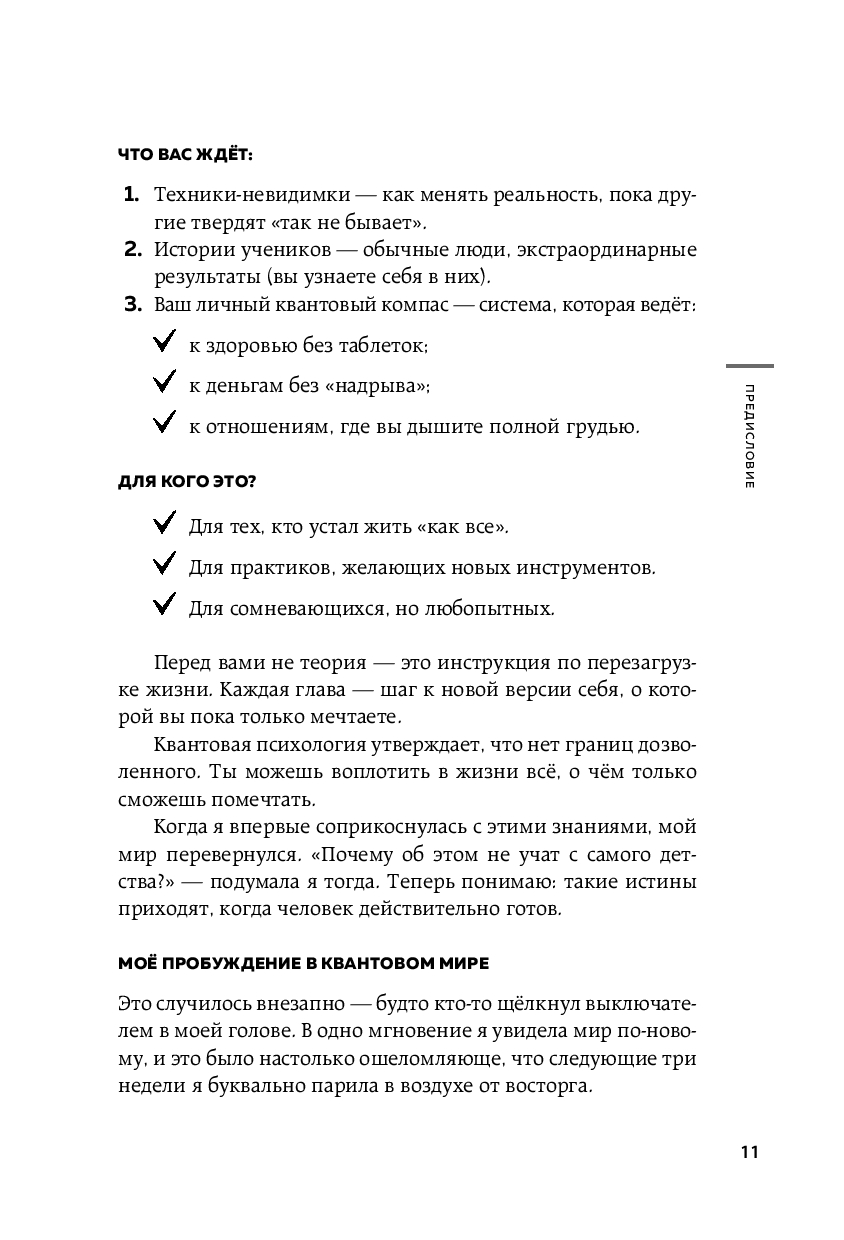 Что Вас ждет внутри? Теория квантовой психологии: что это на самом деле, откуда берет свои начала и почему она намного ближе к нейропсихологии, чем вы можете представить, практики-невидимки – авторские техники, которые занимают буквально несколько минут, но эффект наступает быстро, глубокие практики для проработки своего состояния и улучшения жизни, а глвное – уникальная авторская техника "Квантовые ключи", с помощью которой вы сможете прописать себе то будущее, какое захотите!