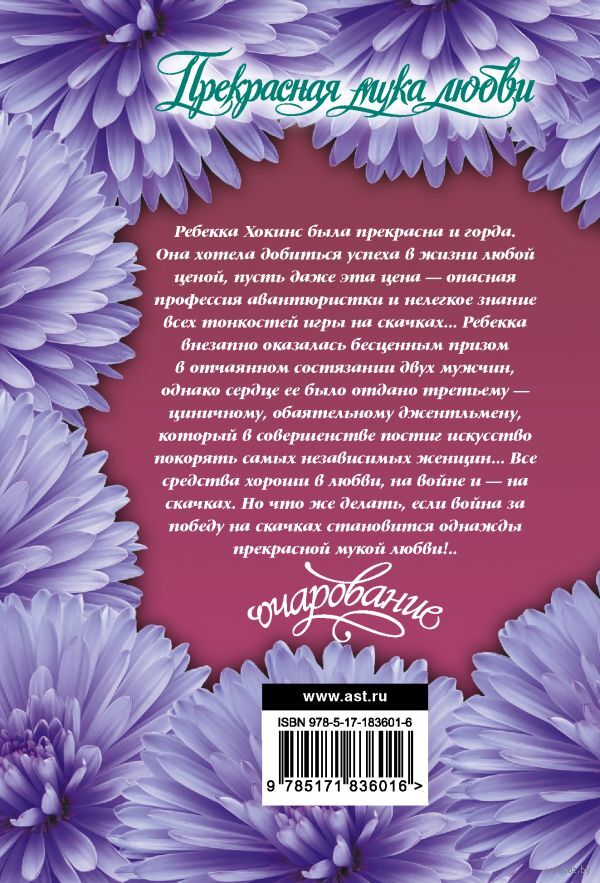 Ребекка Хокинс была прекрасна и горда. Она хотела добиться успеха в жизни любой ценой, пусть даже эта цена – опасная профессия авантюристки и нелегкое знание всех тонкостей игры на скачках... Ребекка внезапно оказалась бесценным призом в отчаянном состязании двух мужчин, однако сердце ее было отдано третьему – циничному обаятельному джентльмену, который в совершенстве постиг искусство покорять самых независимых женщин... Все средства хороши в любви, на войне и – на скачках. Но что же делать, если война за победу на скачках становится однажды прекрасной мукой любви!..