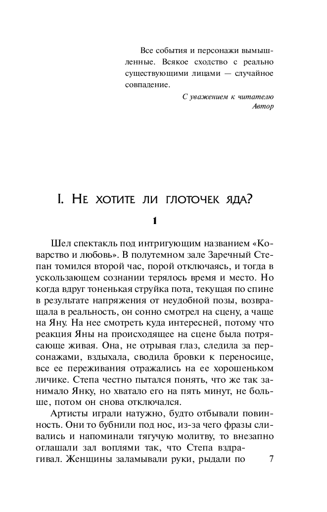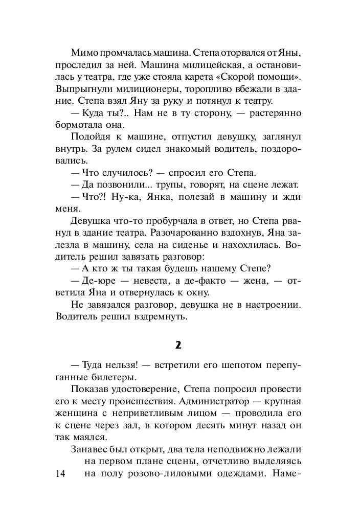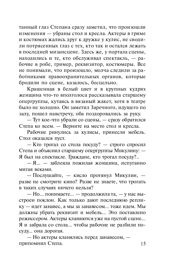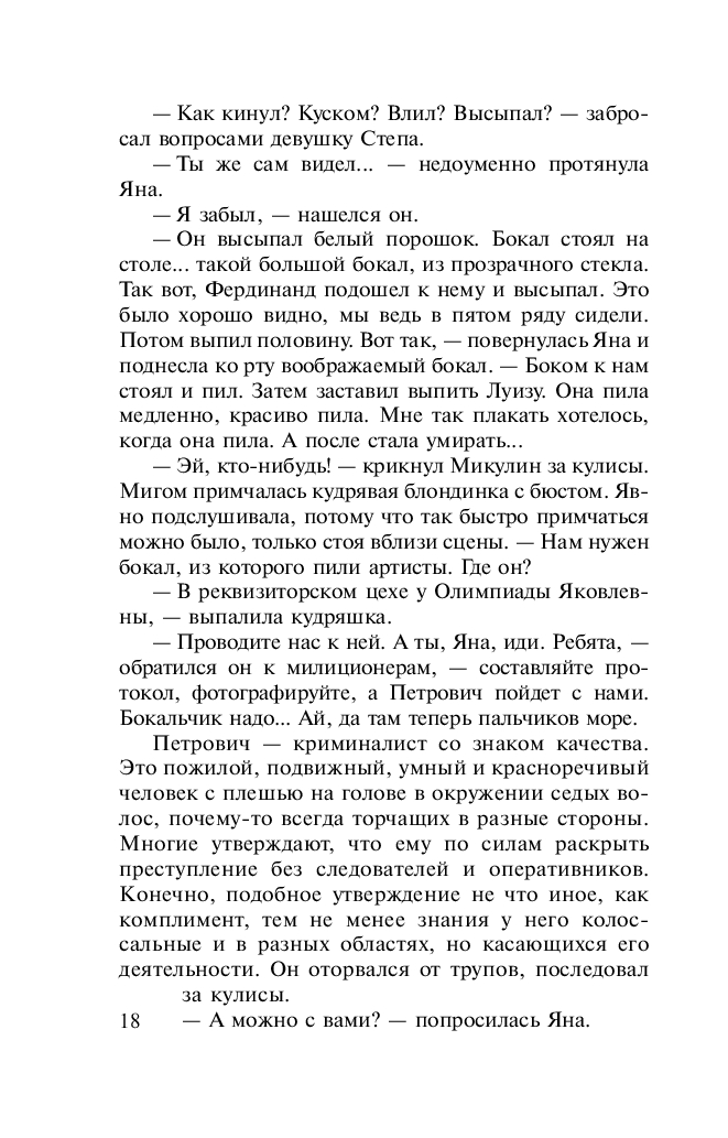 Одно дело играть трагедию на сцене перед зрителями, и совсем другое – быть ее участником в жизни. Все служители Мельпомены, начиная от актеров и кончая рабочими сцены, пребывали в шоке. Ведь совершенно очевидно, что одновременно два актера не могли уйти из жизни просто так, значит, им кто-то помог покинуть этот мир. Главный герой и героиня пьесы "Коварство и любовь" недвижимо лежали на сцене. Из-за грима они выглядели манекенами, а не людьми, небрежно брошенными куклами. Возле тел уже суетились оперативники. Здесь, на сцене, произошло нечто страшное. Но что? Похоже, кто-то из присутствующих выбрал удачный момент и убил артистов прямо во время спектакля. Загадочная смерть заставила каждого невольного участника трагедии оглядеться вокруг: кто убийца?