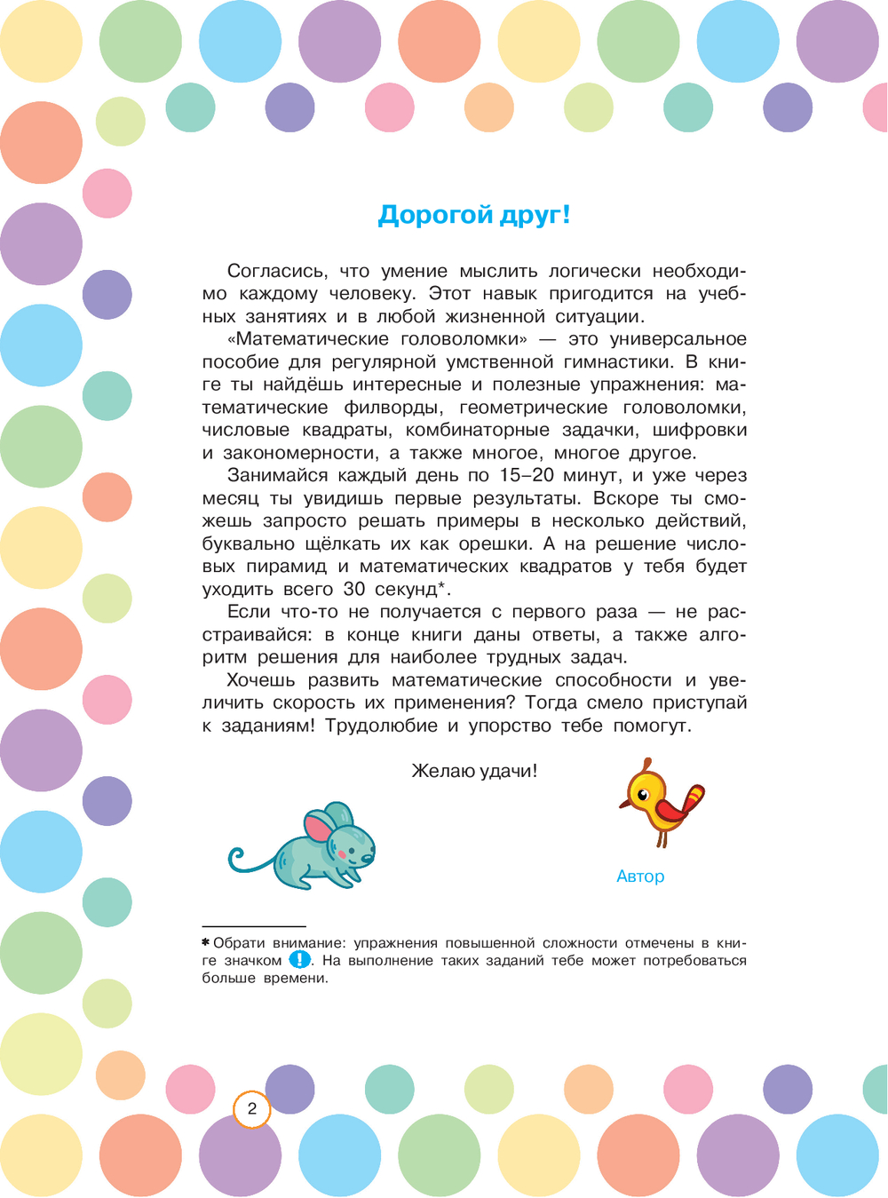 В сборнике "Математические головоломки для развития мозга" – только полезные задания для учеников начальной школы: закономерности, шифровки, числовые квадраты, филворды, геометрические задачи, а также многое другое. Решая головоломки на регулярной основе, школьники смогут развить математические способности и подготовиться к контрольным и проверочным работам. Книгу можно использовать для занятий дома и в классе по всем федеральным программам начальной школы.